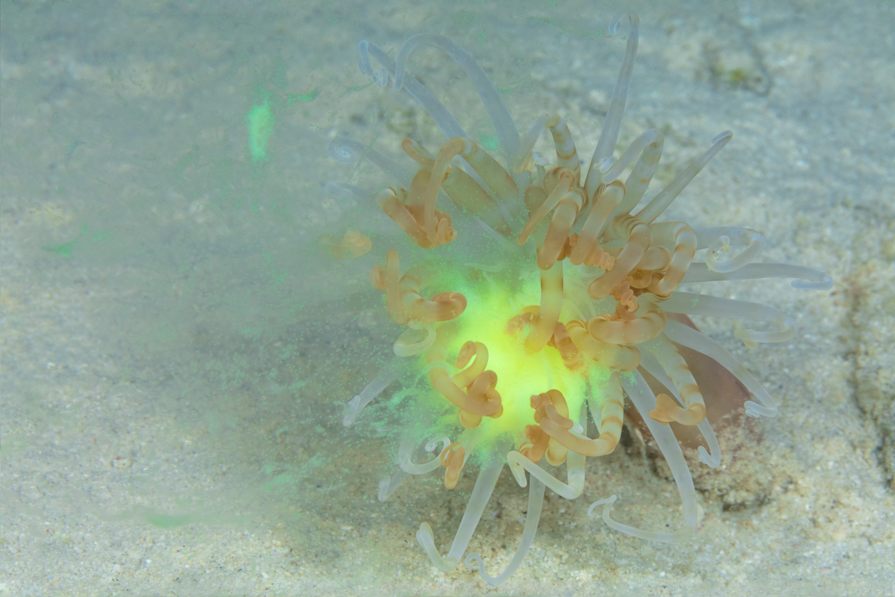 The Banded Tube-Dwelling Anemone emerges at night, feeding with its tentacles extended into the water column. During the day, it hides in long tubes buried in the sand and retracts quickly when exposed to light.