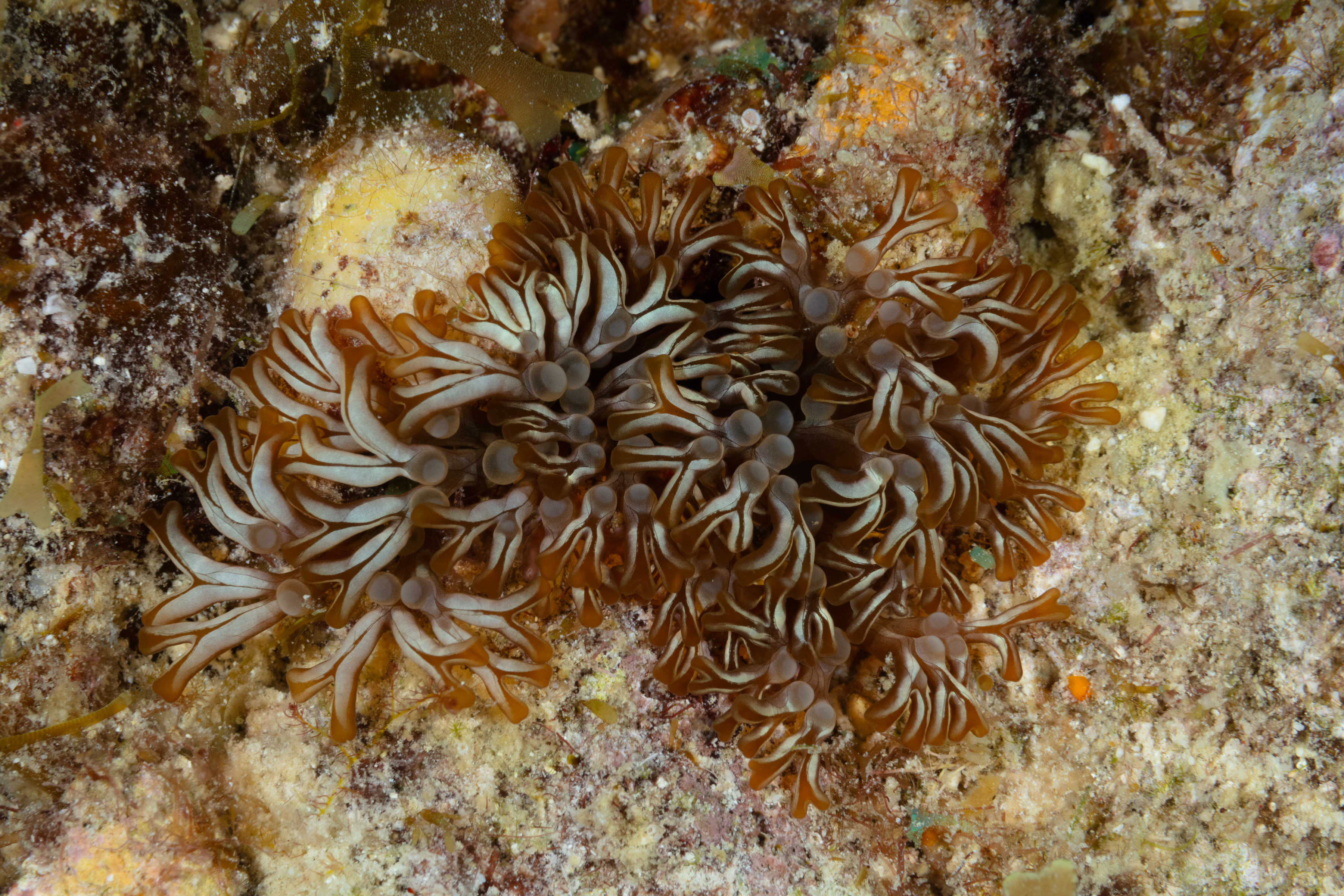 This Species has short, thick tentacle-like structures with small knobs, while its long, real tentacles are visible at night. The body color ranges from brown to gray or blue-green.