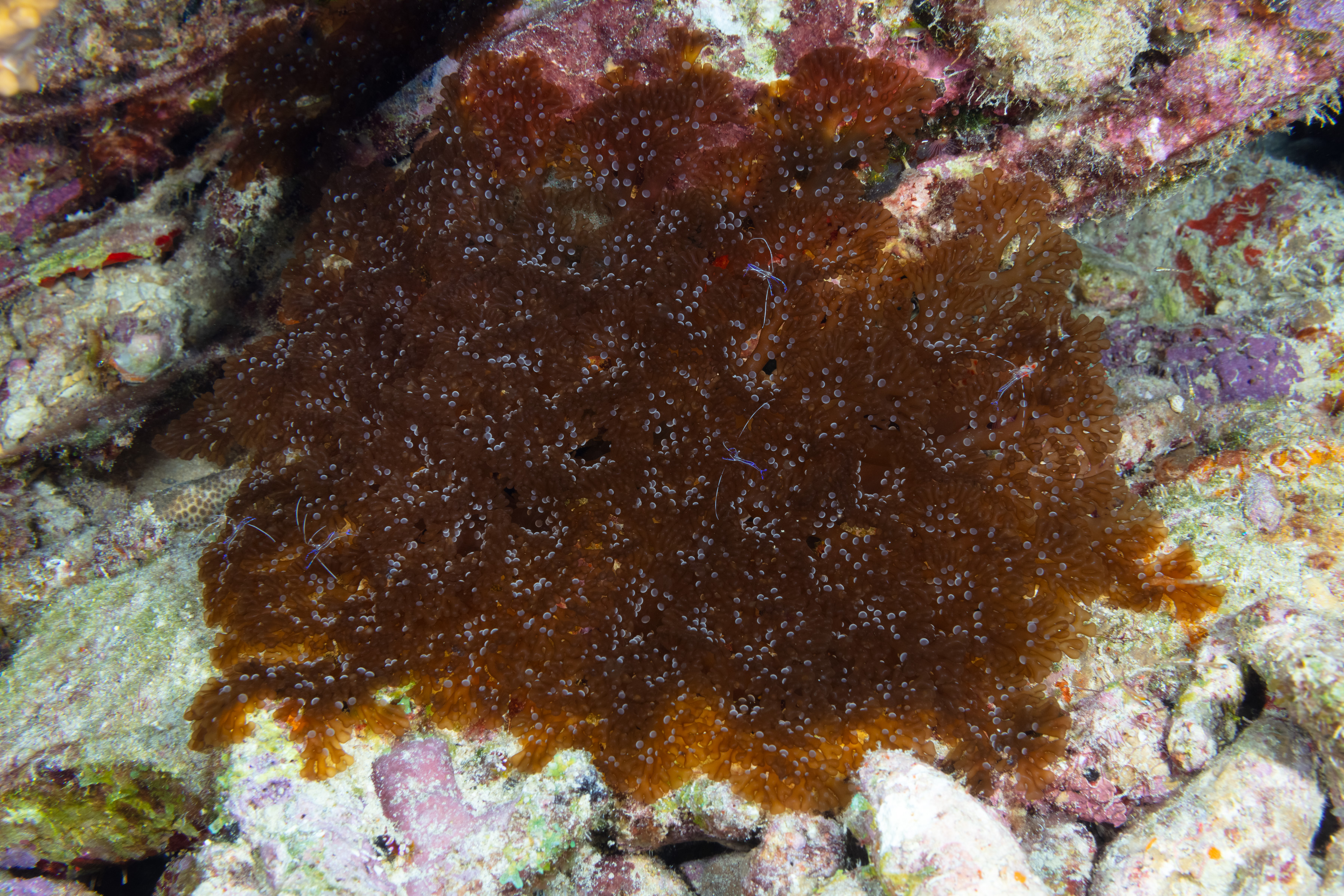 The Branching Anemone often hosts Pederson Cleaner Shrimp that set up cleaning stations.