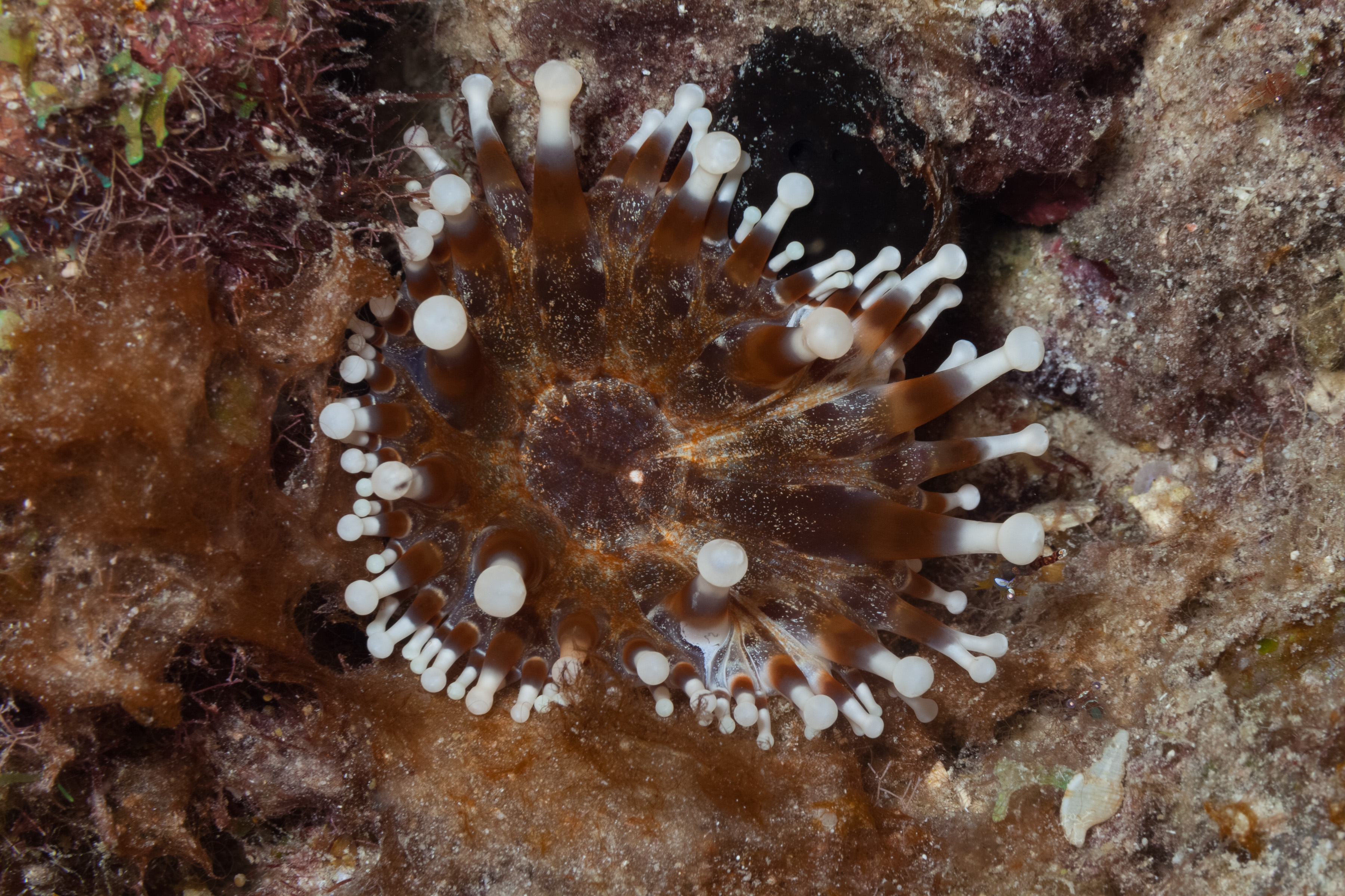 This Anemone has tentacles with thick, rounded tips that resemble small clubs, surrounding a central oral disc. The body shows a variety of colors and markings.