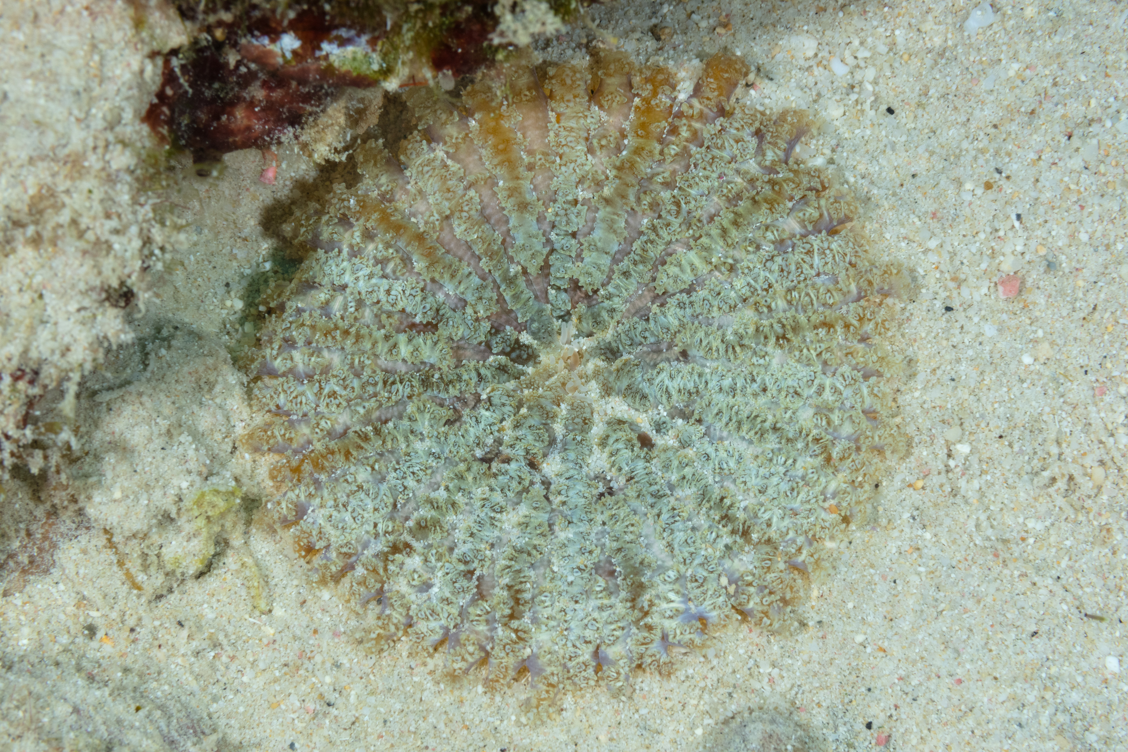 This Anemone's color ranges from beige to pinkish-brown or green-gray. It has a flat central disc covered in small, rounded bumps. Its tentacles form a pattern of rectangular shapes along the edge, with shorter tentacles near the mouth.