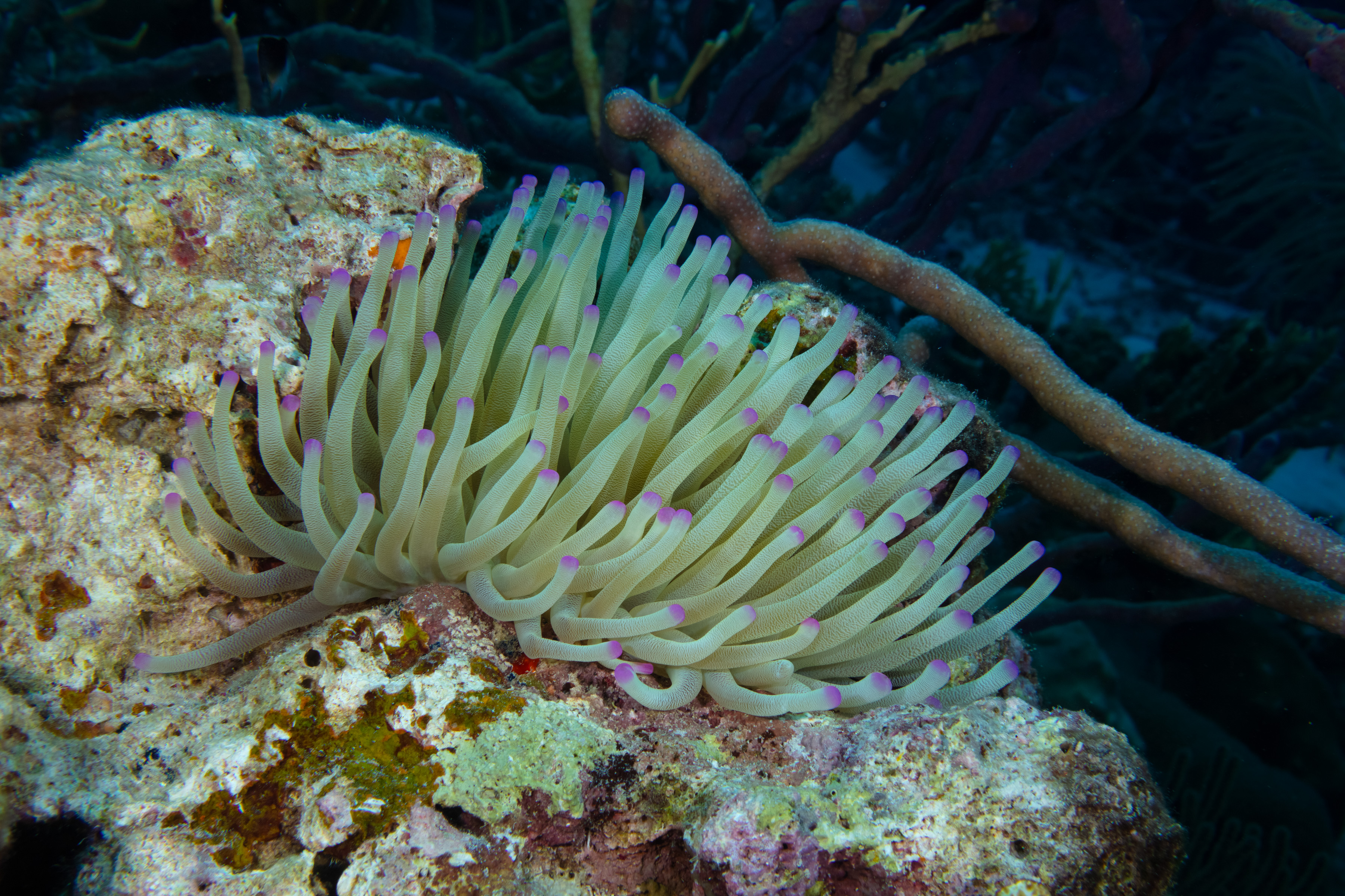 This Anemone is the largest of its kind. It has long tentacles with tapered or bulbous tips in shades of white, gray, or yellow-green, often ending in pink or purple.