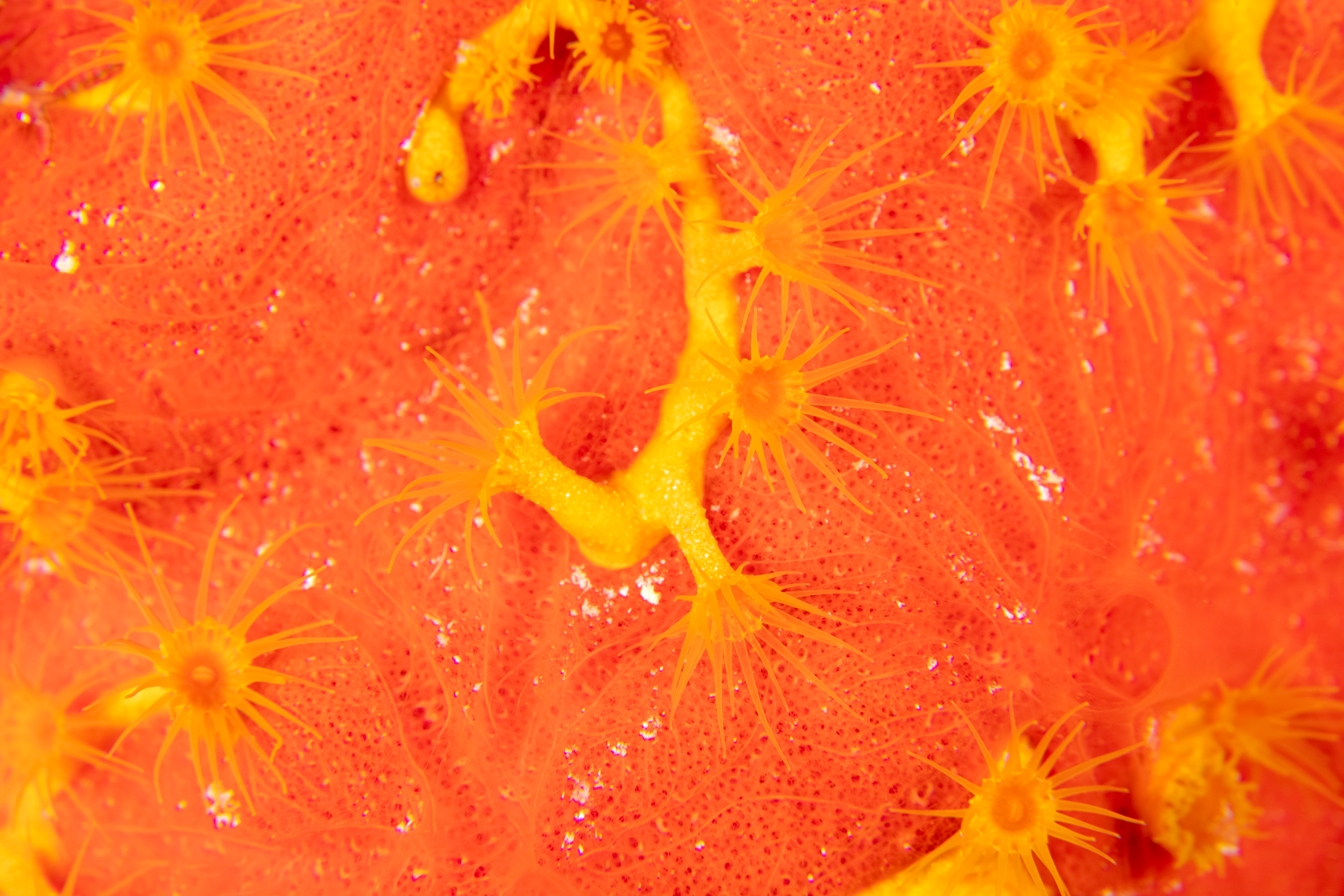 This Species has small, golden-yellow polyps that often form dense rows along sponges. It grows in large colonies.