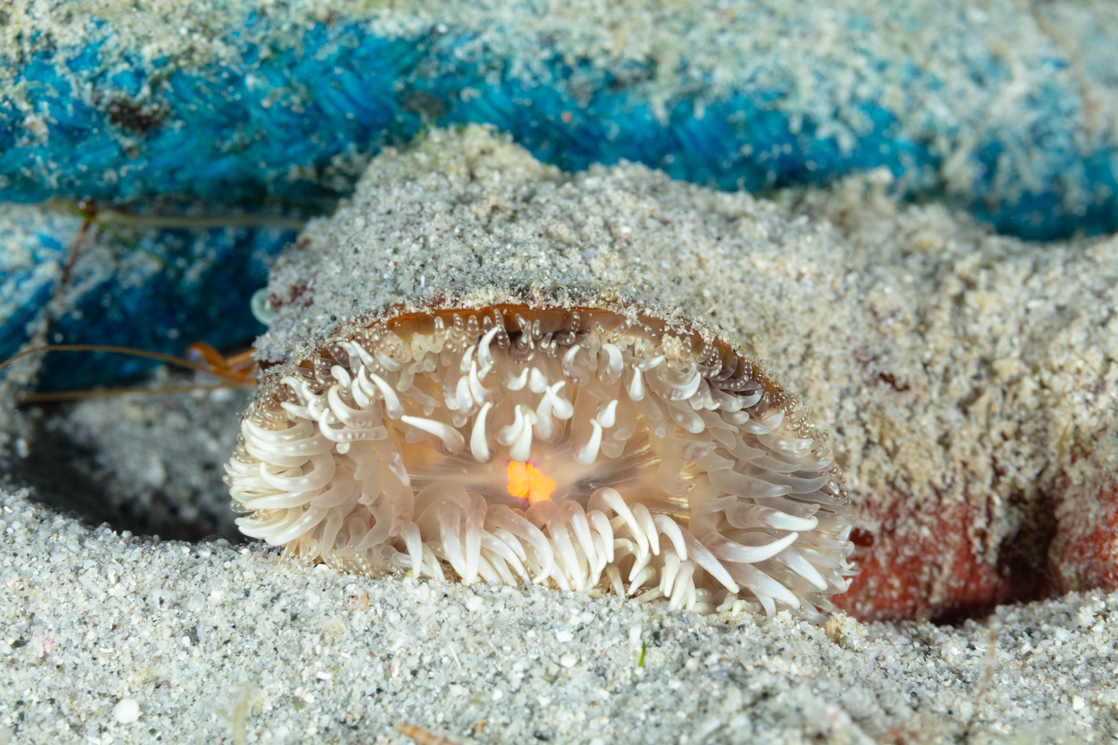 In this photo, the Hitchhiking Anemone got stranded. Unfortunately, the Hermit Crab that carried it around died. It is unknown if this Anemone can find a new host.