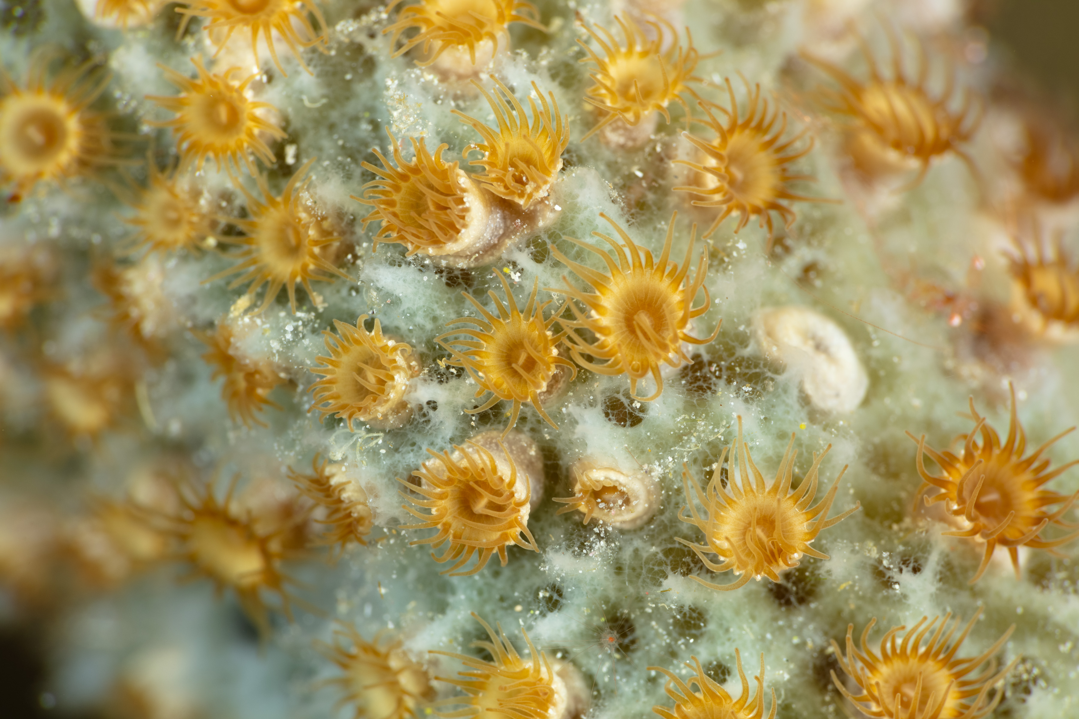 The Sponge Zoanthid only lives on certain sponges, mostly on the Branching Vase Sponge and the Red Boring Sponge. Typically, a single larva settles and then spreads across its sponge host by budding, forming large, genetically identical colonies on one sponge.