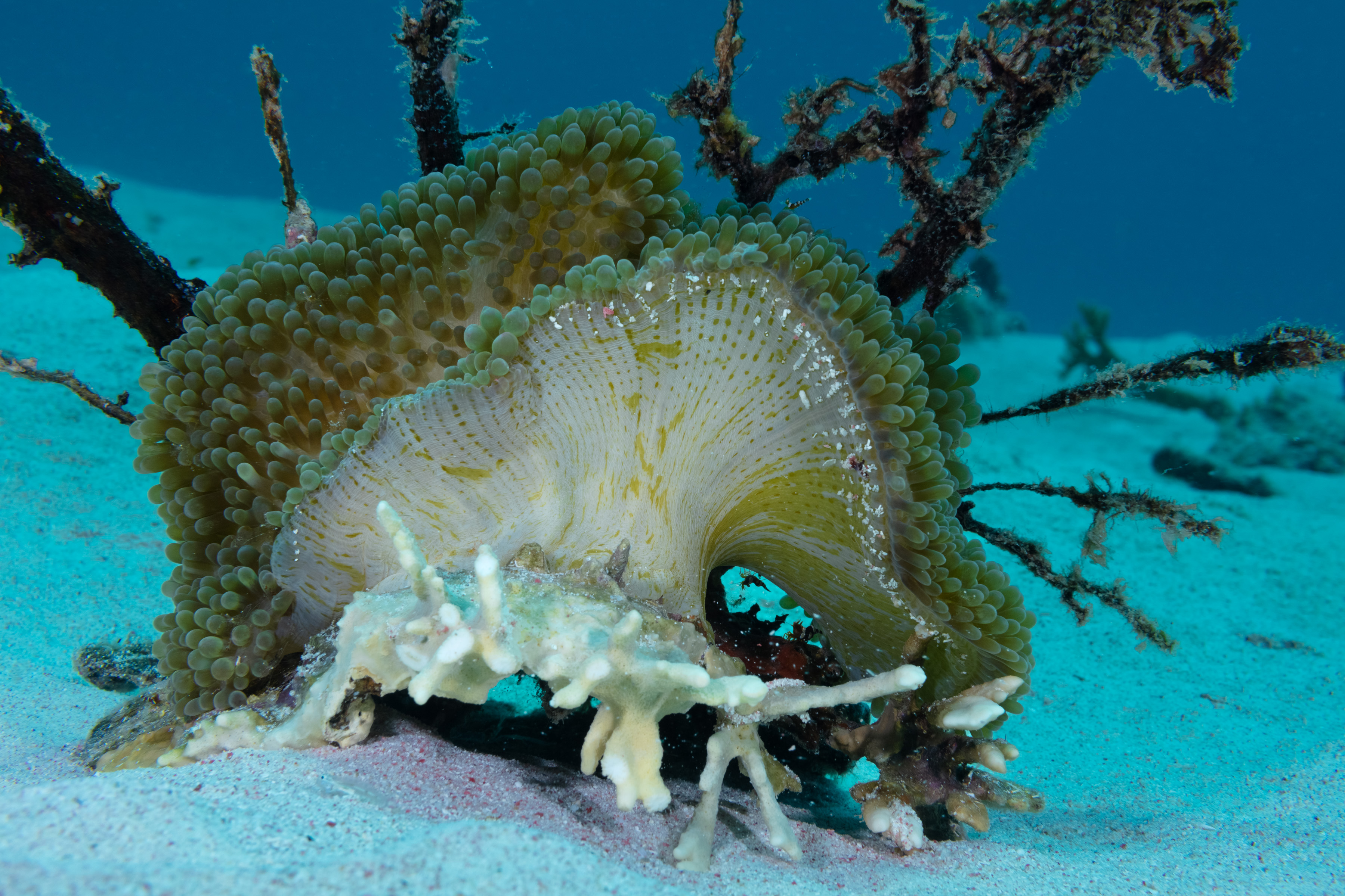 The Sun Anemone provides habitat for small Shrimp, such as the Sun Anemone Shrimp and Squat Anemone Shrimp.