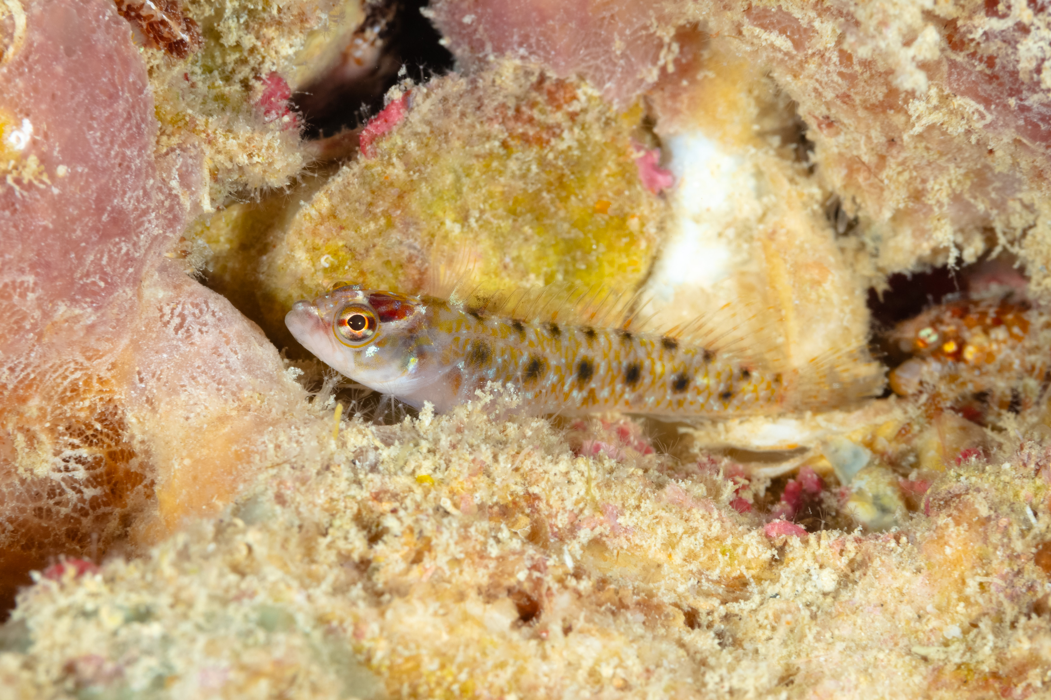 This Blenny has two to three rows of separated dark blotches along its sides. It has a bluntly pointed head, unbranched cirri, and a reddish area behind its head.