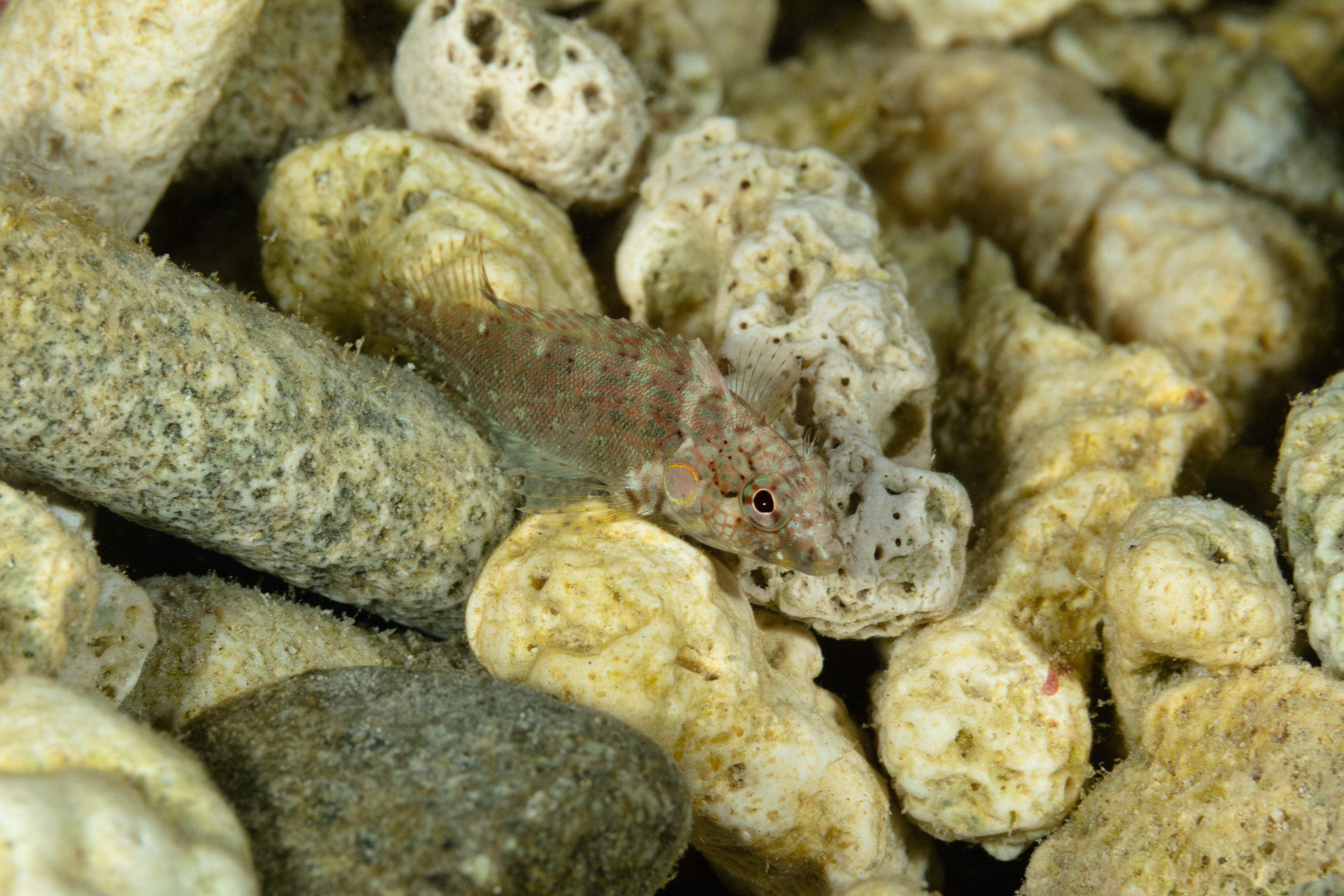 The Hairy Blenny can be found in shallow waters with rubble and rocks.
