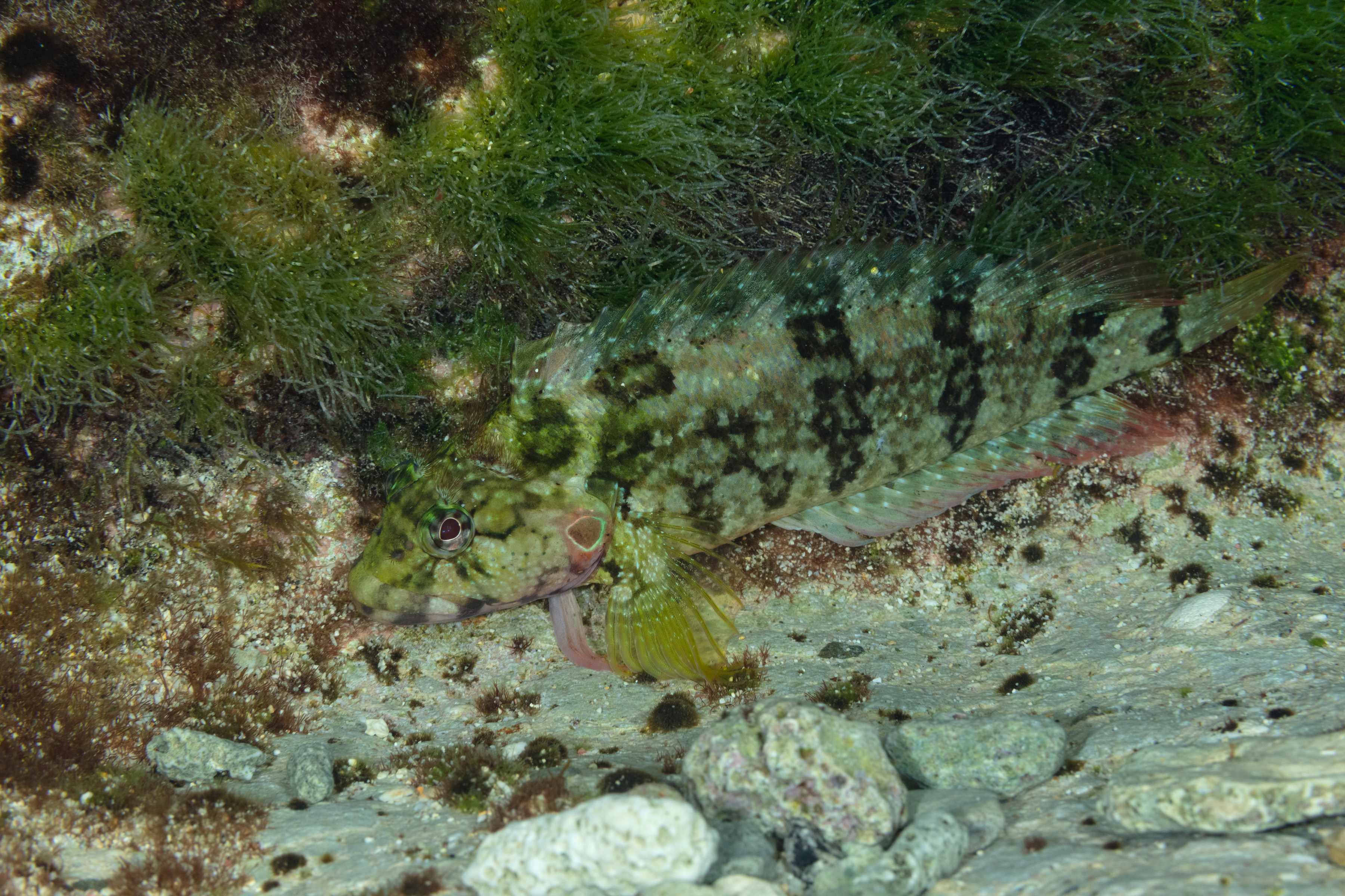 The Hairy Blenny can be found in shallow waters with rubble and rocks.
