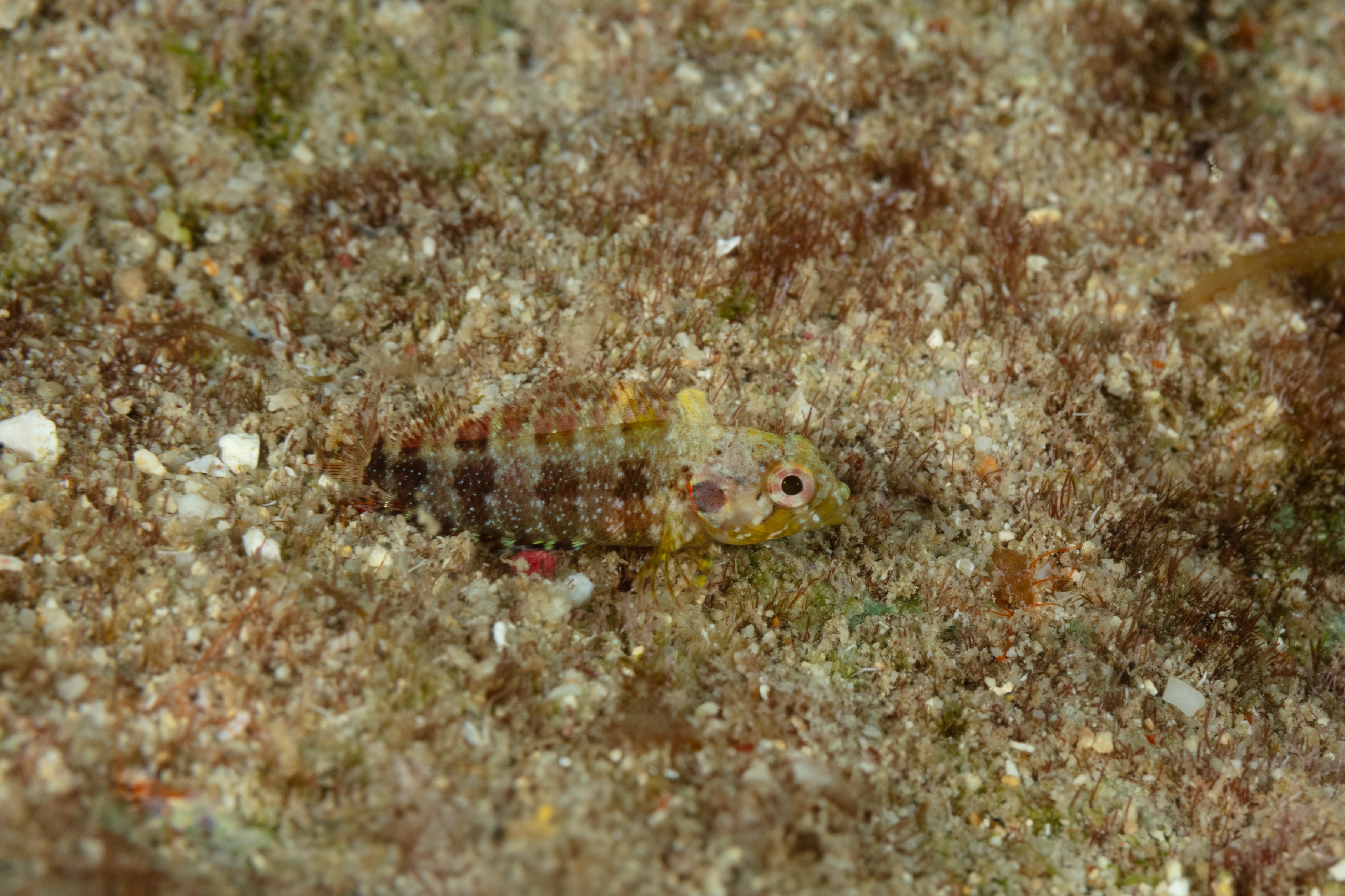 This Blenny has a body that varies from pale to green or reddish-brown, with irregular dark bars along its body. It may have a large spot on its gill cover, sometimes outlined with a colored border.