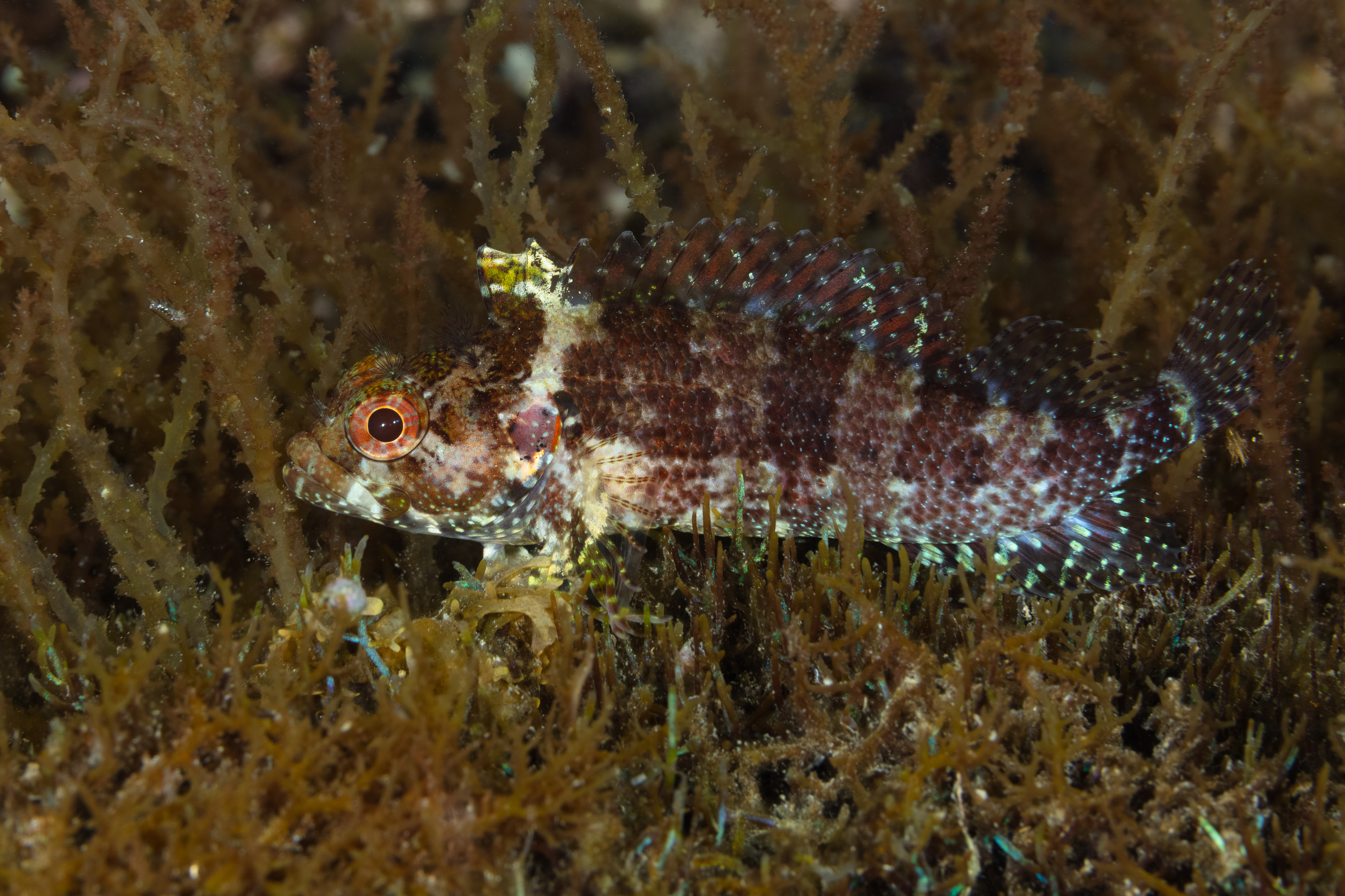This Blenny has a body that varies from pale to green or reddish-brown, with irregular dark bars along its body. It may have a large spot on its gill cover, sometimes outlined with a colored border.