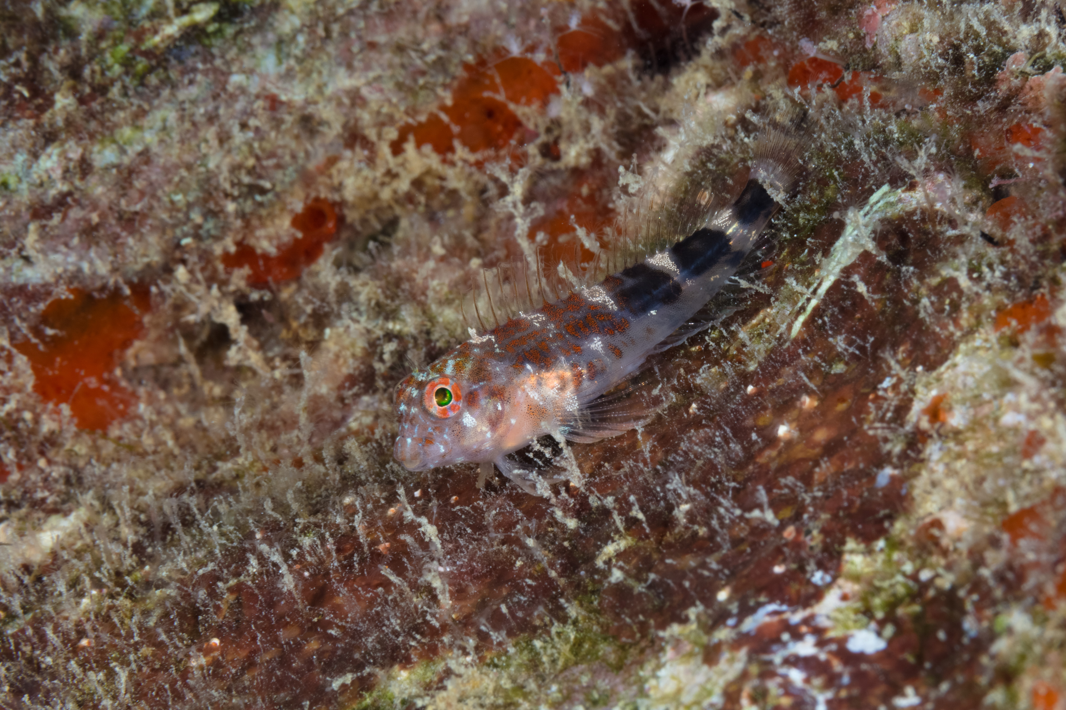This Blenny has a pale bluish body with wide dark bars on the rear, separated by narrow white ones. The head and front body are covered in reddish-orange spots and markings. The eyes have red bands with narrow blue lines in between.
