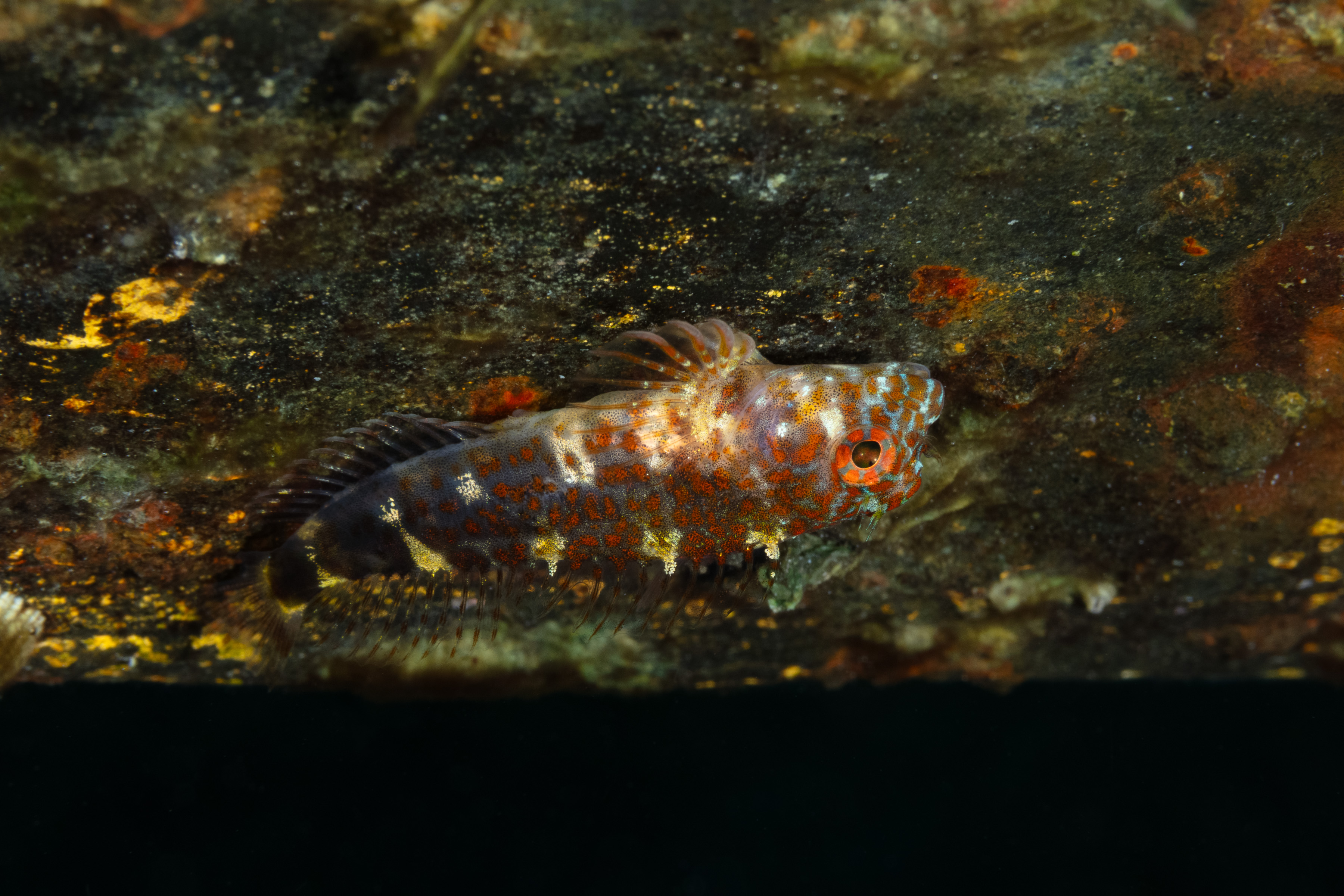 The Orangespotted Blenny can be found in shallow waters, often sheltering in Barnacle Shells on pier pillars.