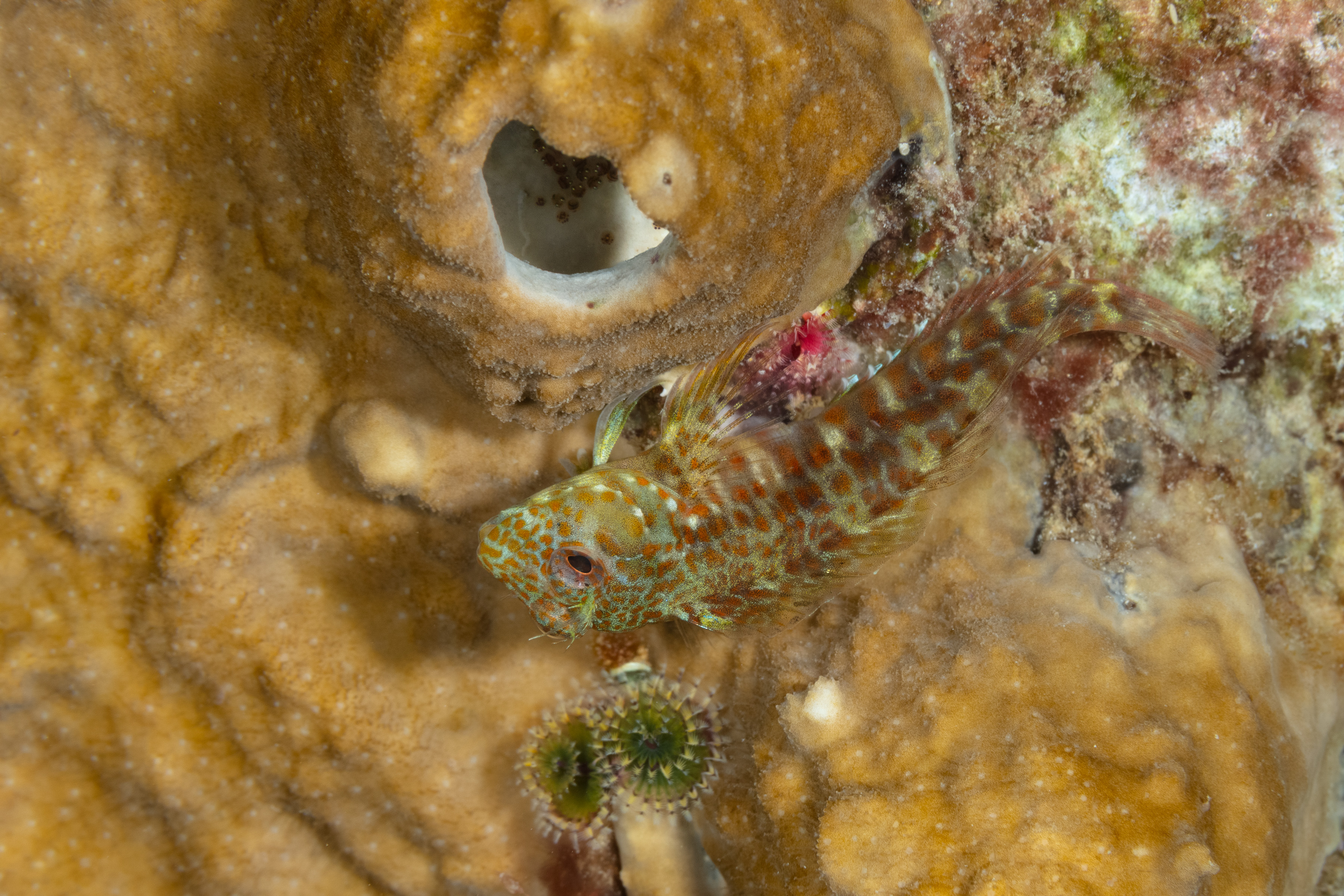 This Blenny has a noticeable small spot just below its eye and often a larger blotch at the front of the dorsal fin. The eyes have alternating red and gray spokes. Males have small orange spots on the head and upper body, while females display groups of dark brown blotches along the upper body.