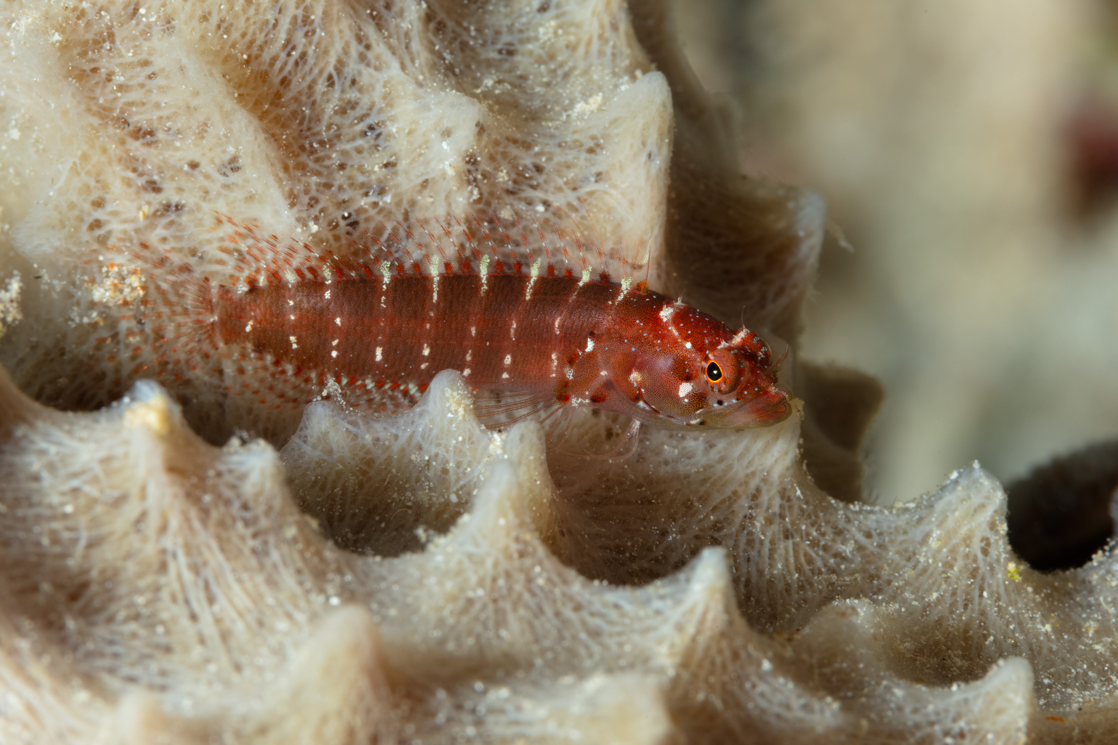 The Ringed Blenny often hides inside sponges, particularly in Elongated Vase Sponges, and quickly retreats deeper when approached.
