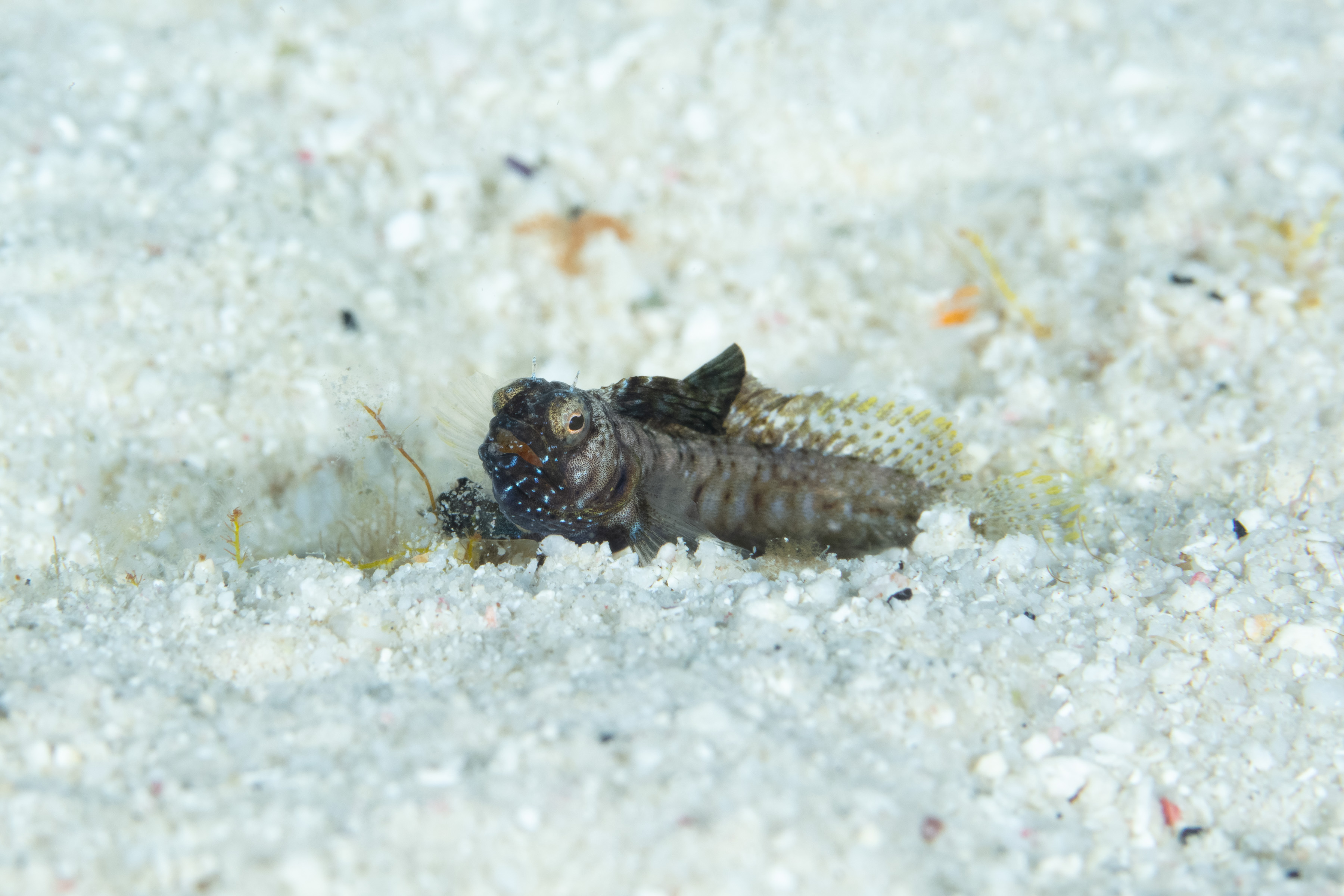 The Sailfin Blenny lives in small groups in sandy and rocky areas. It stays inside its hole with only its head visible. Males jump from their shelter and raise and lower their large dorsal fin, most often in the late afternoon. It quickly retreats when disturbed but can be observed if approached carefully.