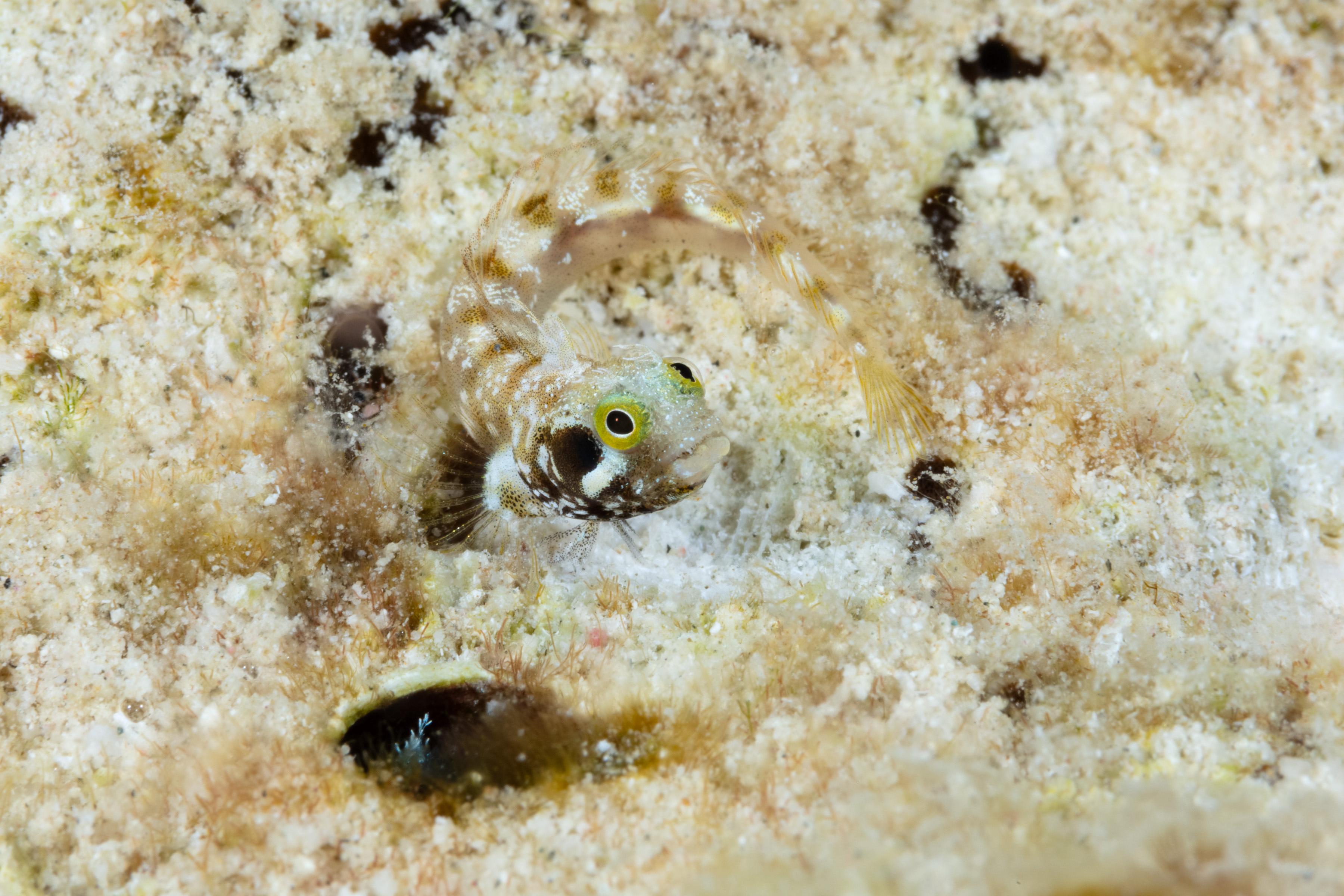 The Spinyhead Blenny lives in empty worm tubes within coral, with its head sticking out. When small bits of food drift by, it darts out to grab them before quickly retreating into its hiding place.