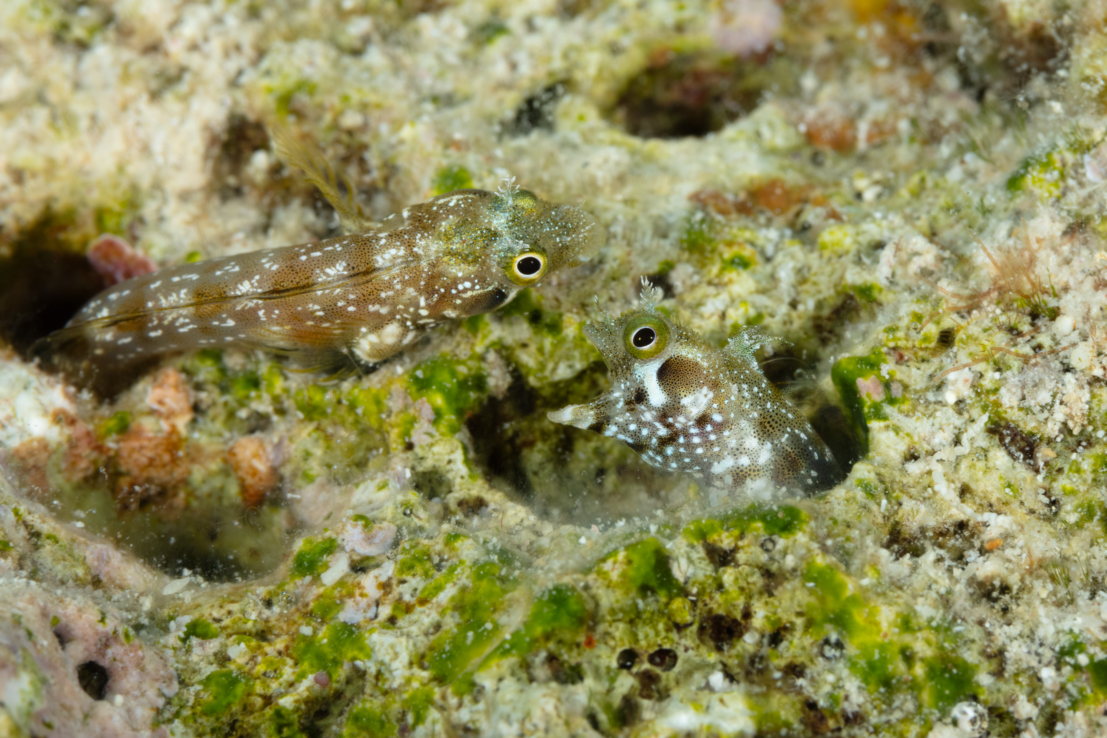 The Spinyhead Blenny lives in empty worm tubes within coral, with its head sticking out. When small bits of food drift by, it darts out to grab them before quickly retreating into its hiding place.