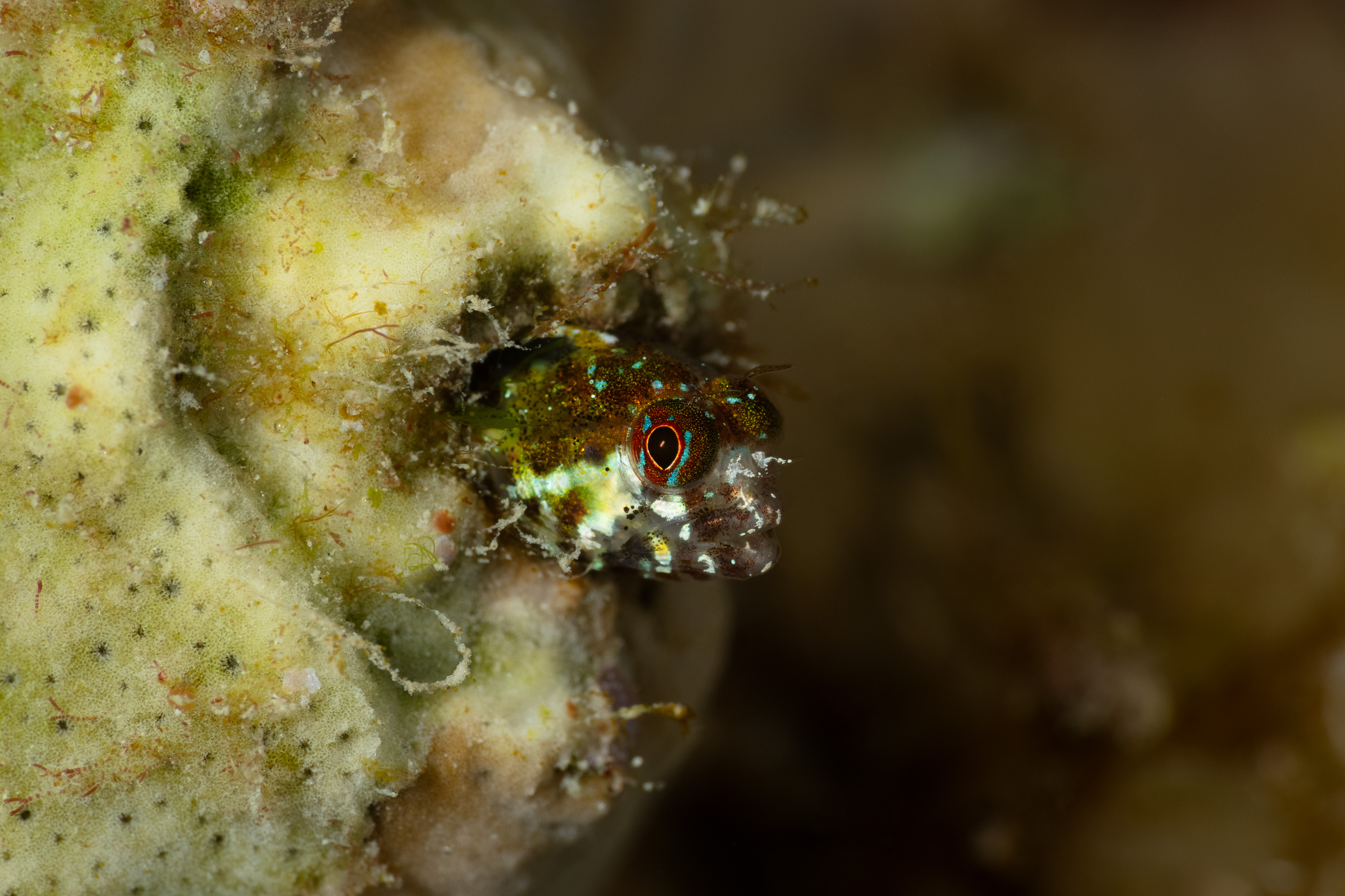 The Twinhorn Blenny inhabits holes in rocky areas near the shoreline. It is not shy and rarely moves unless closely approached.