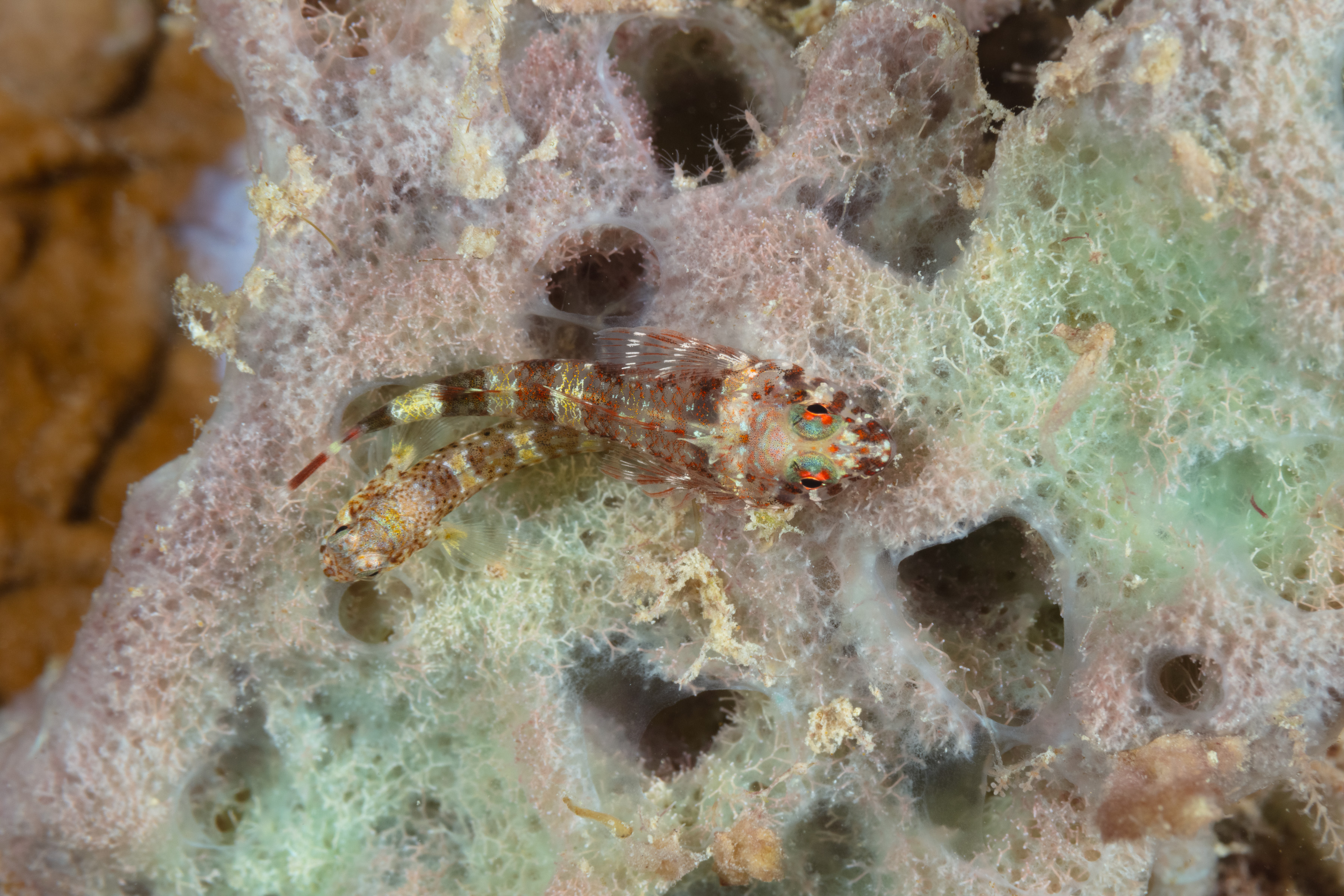 This Triplefin has a red-brown translucent body with a diamond-patterned texture. Dark bars run along its length, with two bars much darker near the tail and a much lighter bar in between. Males display a bright yellow head when guarding eggs or courting.