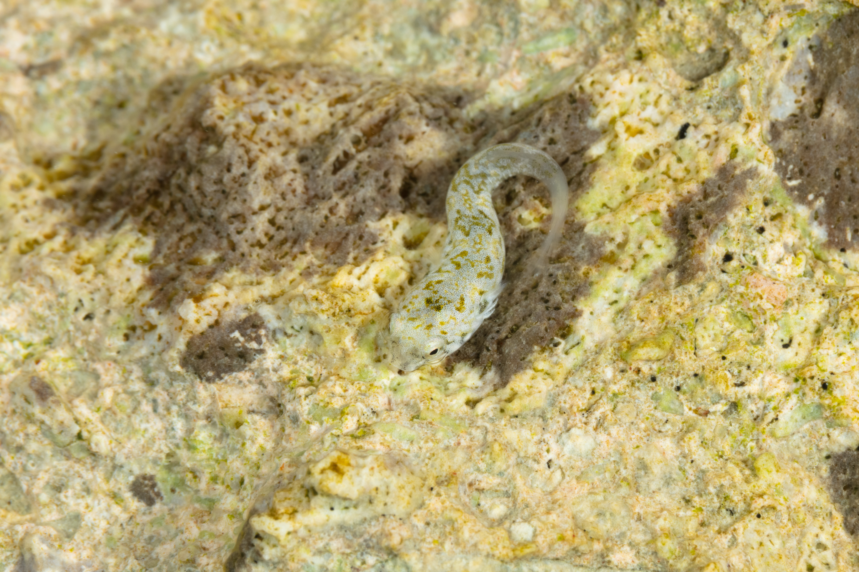 This Barred Clingfish, also known as Surge Clingfish, lives in shallow rocky areas with waves and currents. Its suction disk helps it grip rocks tightly, and its flat body fits into narrow cracks.