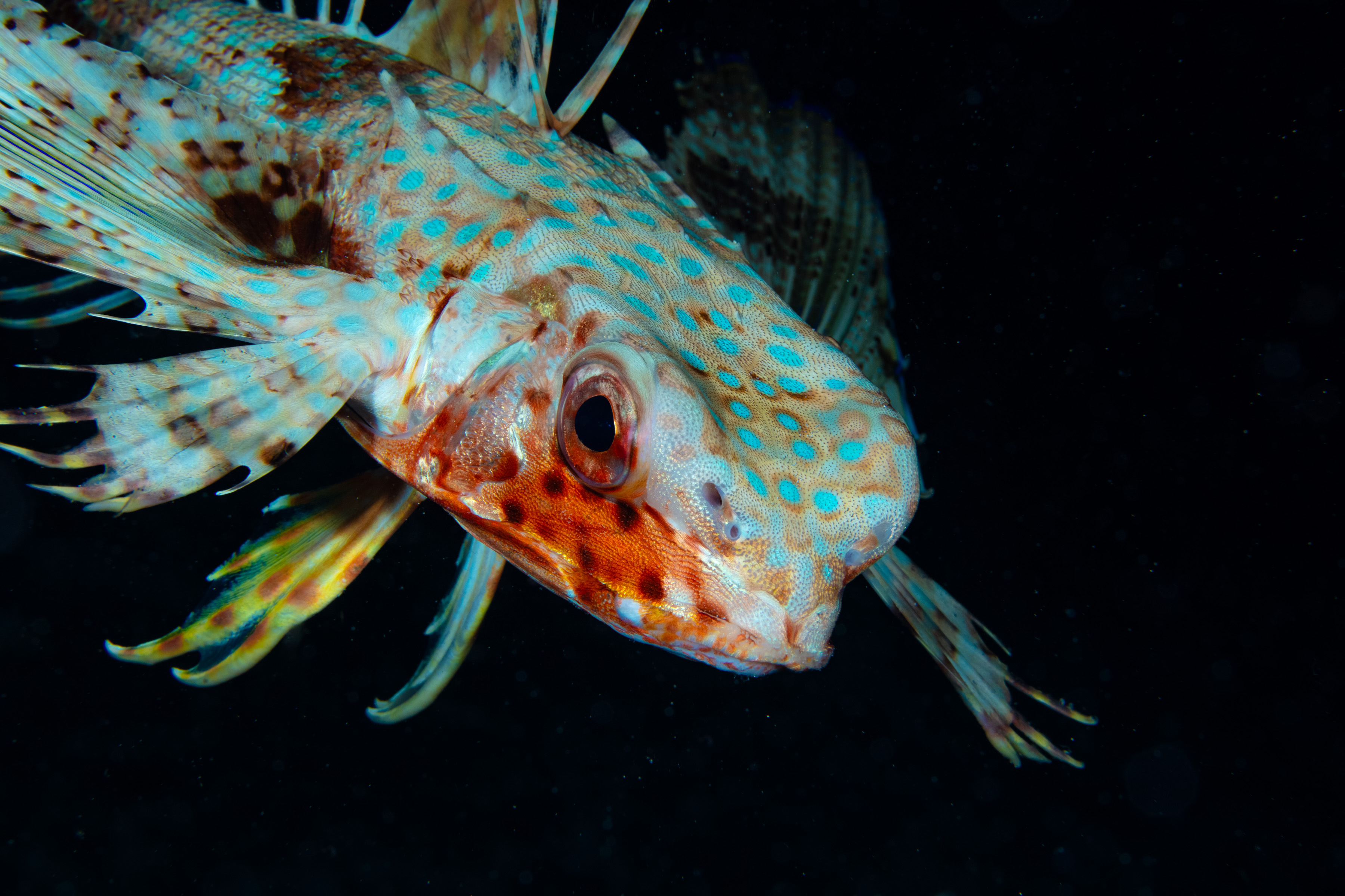 This Gurnard has large, fanlike pectoral fins that reach its tail when folded and show bright blue lines and dots when spread. Its body can be gray to yellow-brown with white spots, and it can change color dramatically. It has a blunt snout and three thick, fingerlike spines on each pectoral fin.