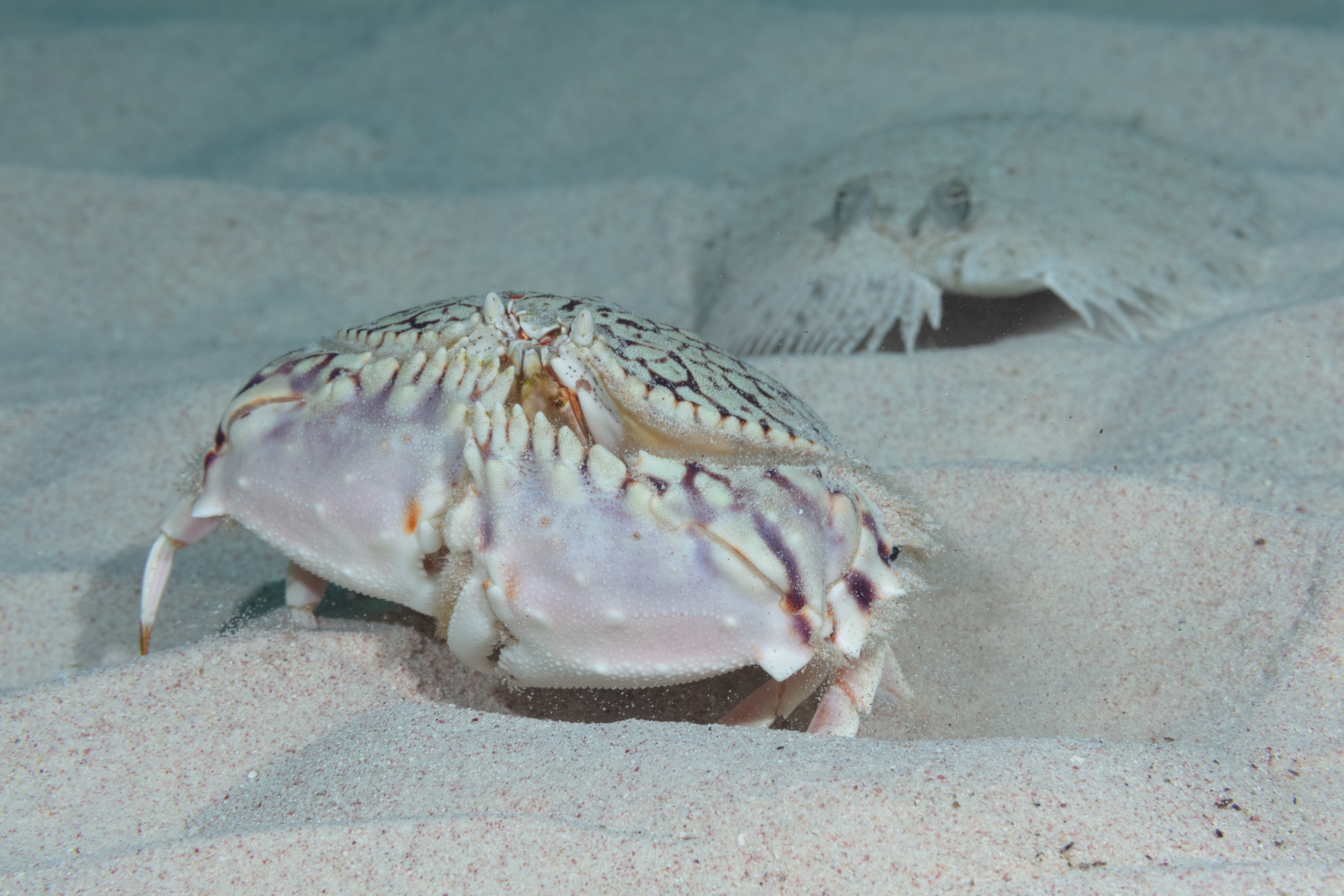 The Maculated Flounder often follows Flame Box Crabs to feed on small animals disturbed while the crab digs. This allows the flounder to find food without searching the sand itself.