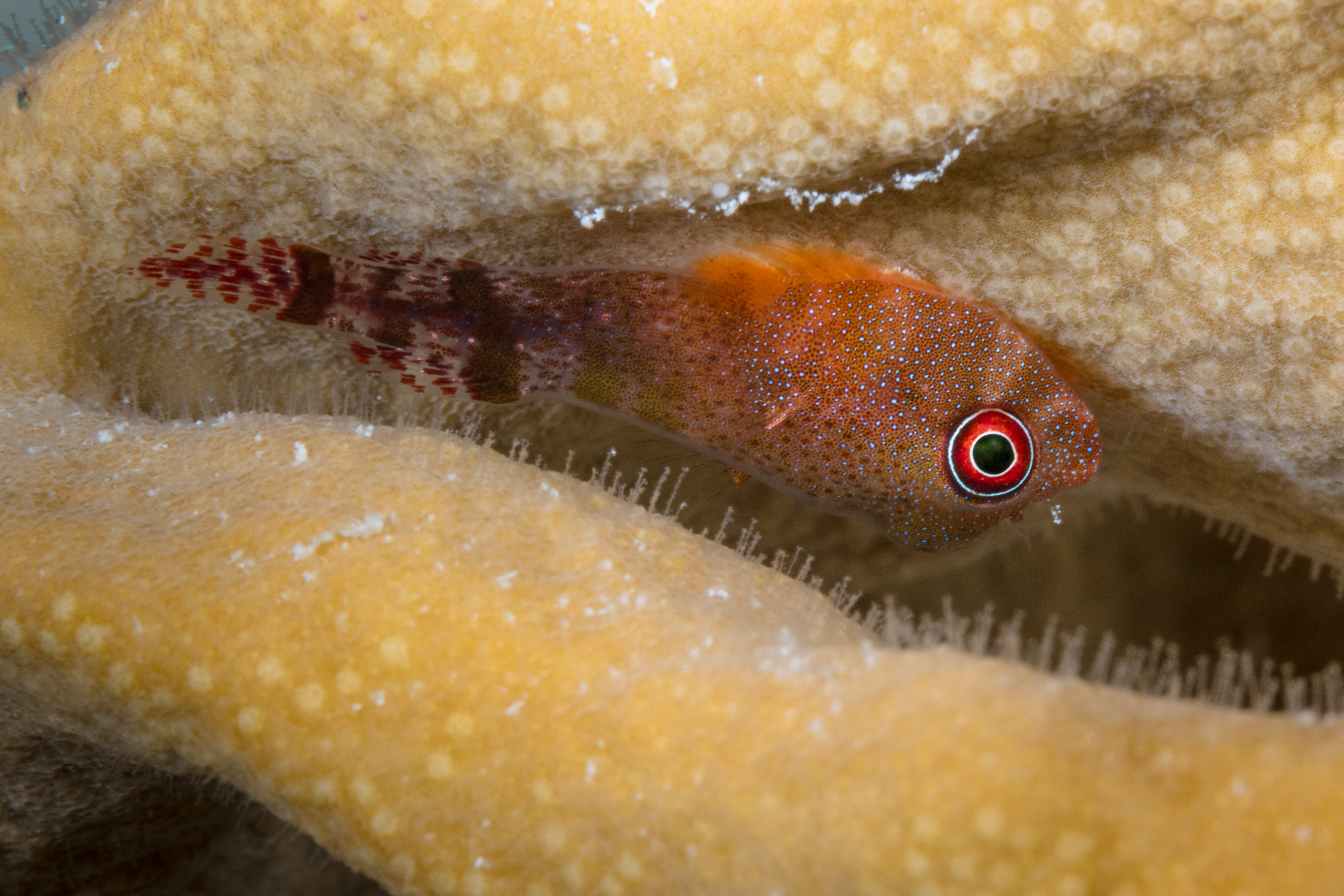 The Papillate Clingfish is often found in shallow waters between the blades of Fire Coral.