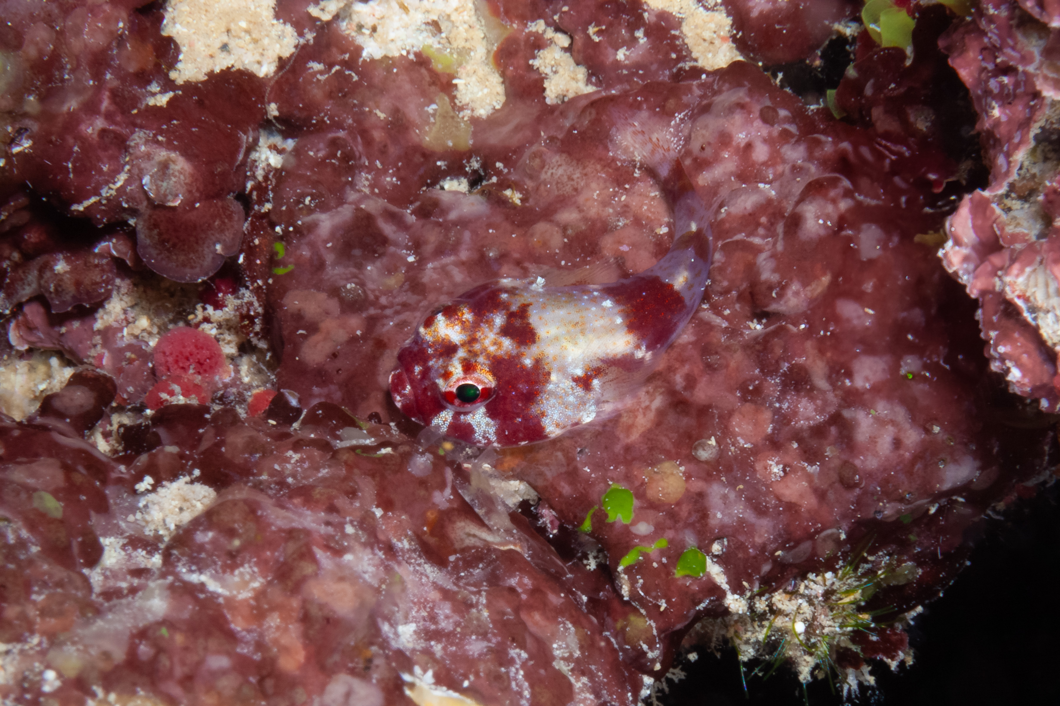 This Clingfish has a reddish body with numerous small pale blue, white, or orange spots. Two white bands extend from below the eye across the cheek.