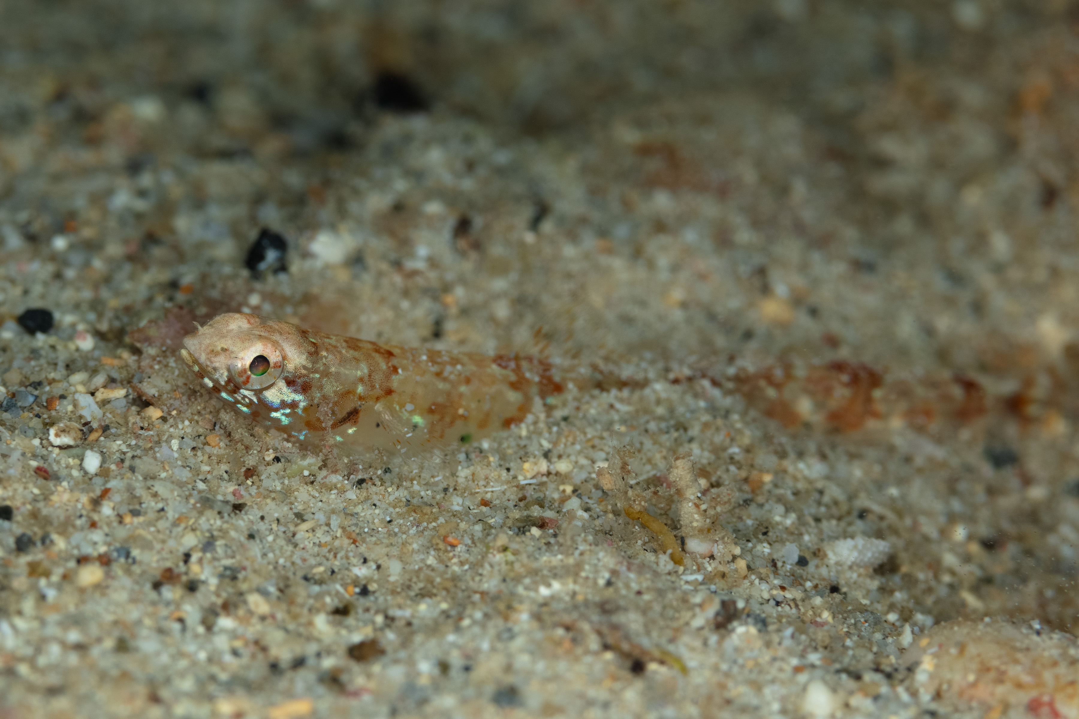 This Lizardfish has reddish or light brown bars running across its back, outlined with a thin blue, S-shaped border.