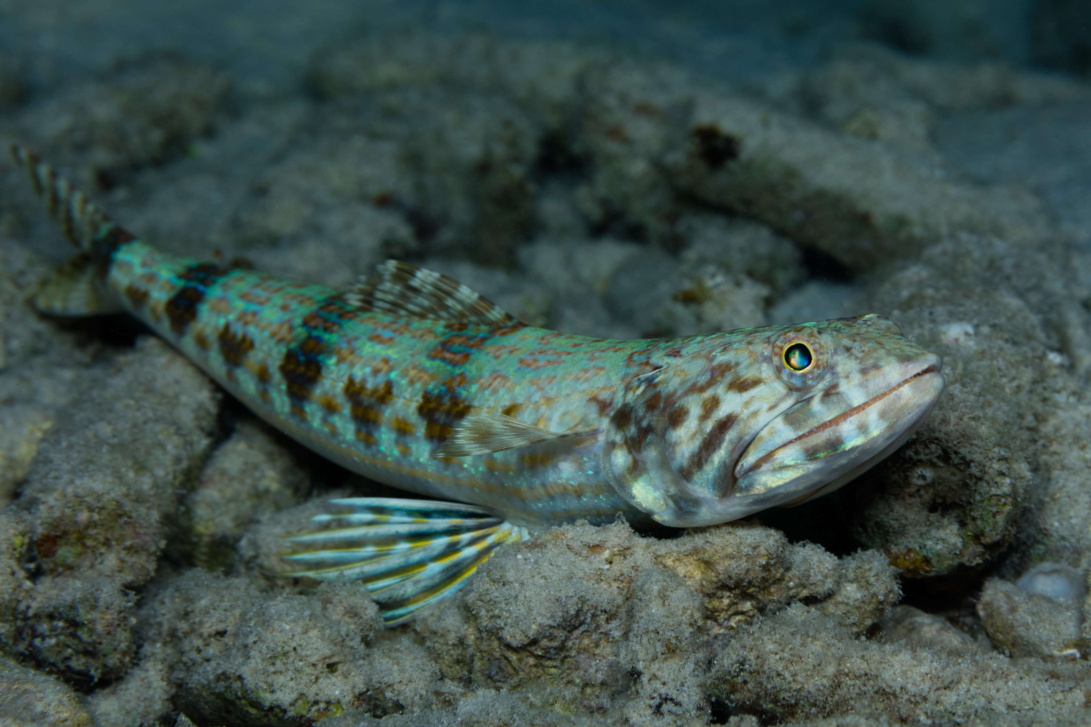 This Lizardfish has a pale turquoise body marked with light brown bars and diamond patterns along the sides. Thin blue stripes may complement the bars. Its fins look banded by yellow or brown stripes.