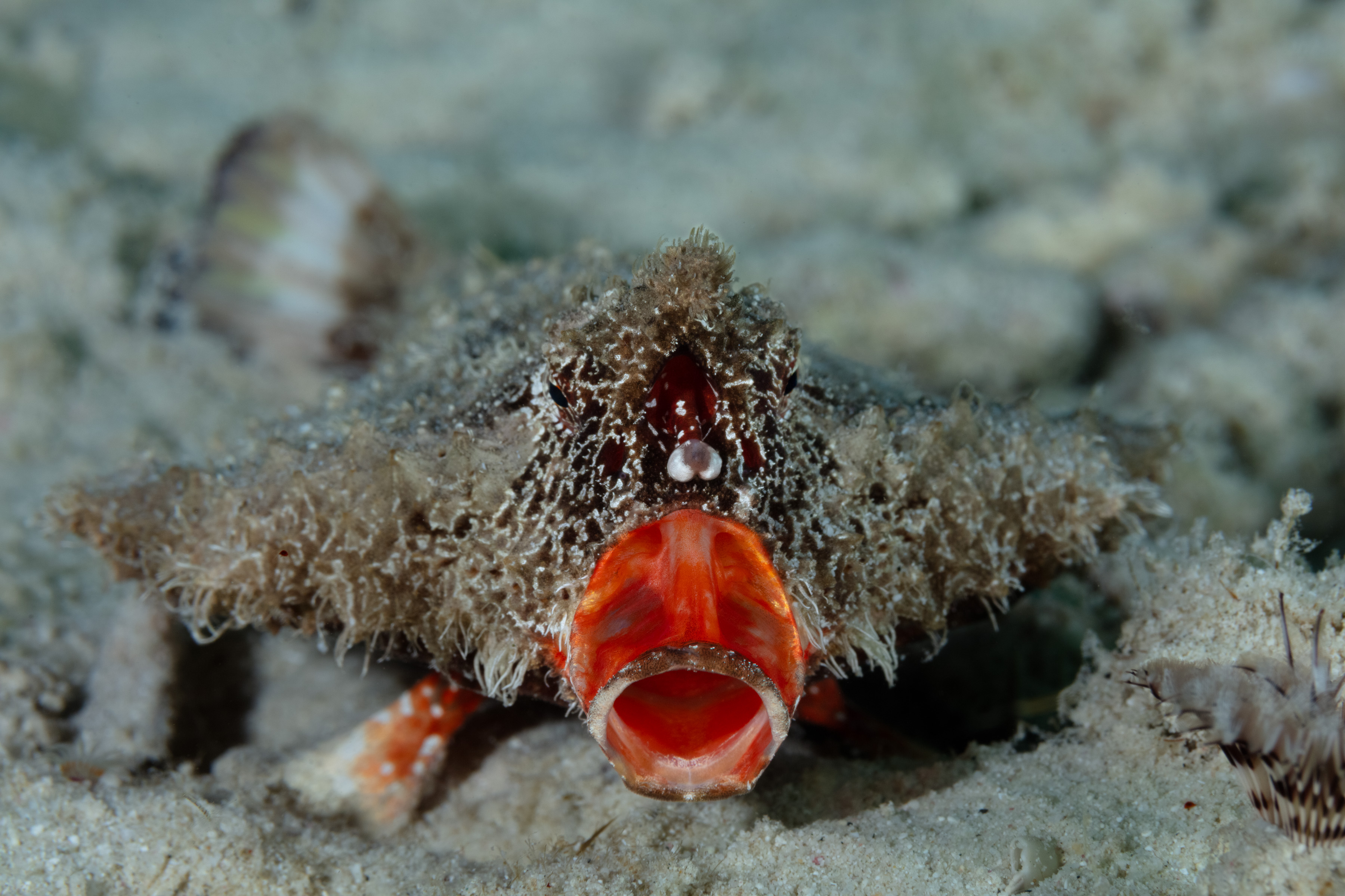 The Shortnose Batfish can be found on sandy, muddy, or rocky areas, often near the reef. It uses its lure to attract prey and hunts for small shellfish and mollusks. It is not shy, but moves away when disturbed.