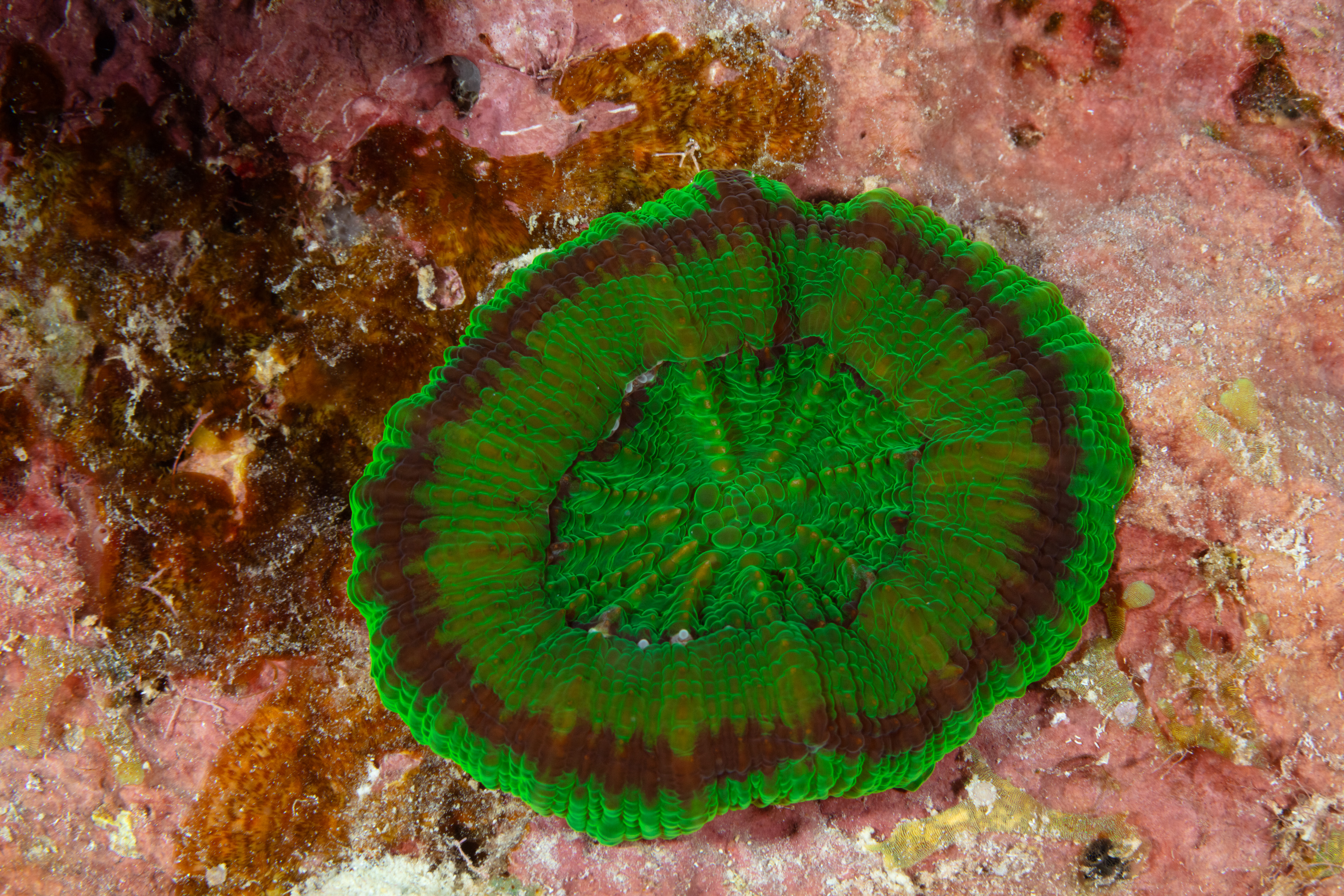 Artichoke Coral hides in deeper, shaded areas under ledges or inside caves. During the day, its tentacles are usually retracted.
