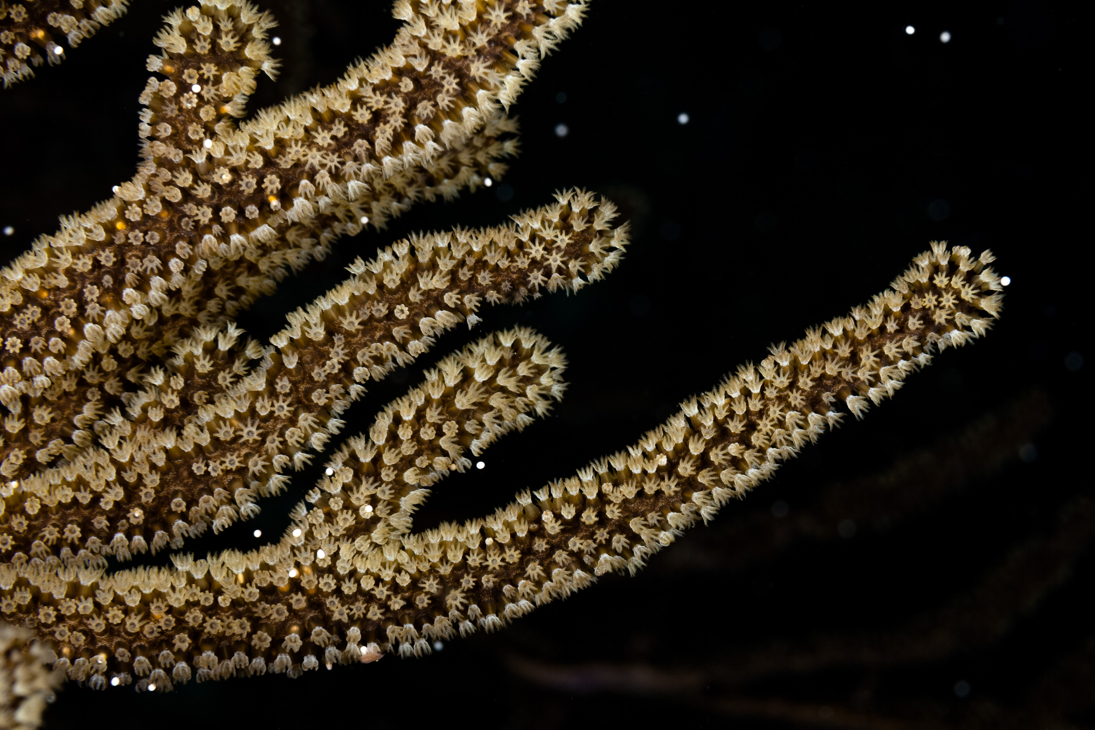 This Coral forms branching colonies in flat, vertical shapes. The branches range from brown to black, with small, lighter-colored polyps along them.