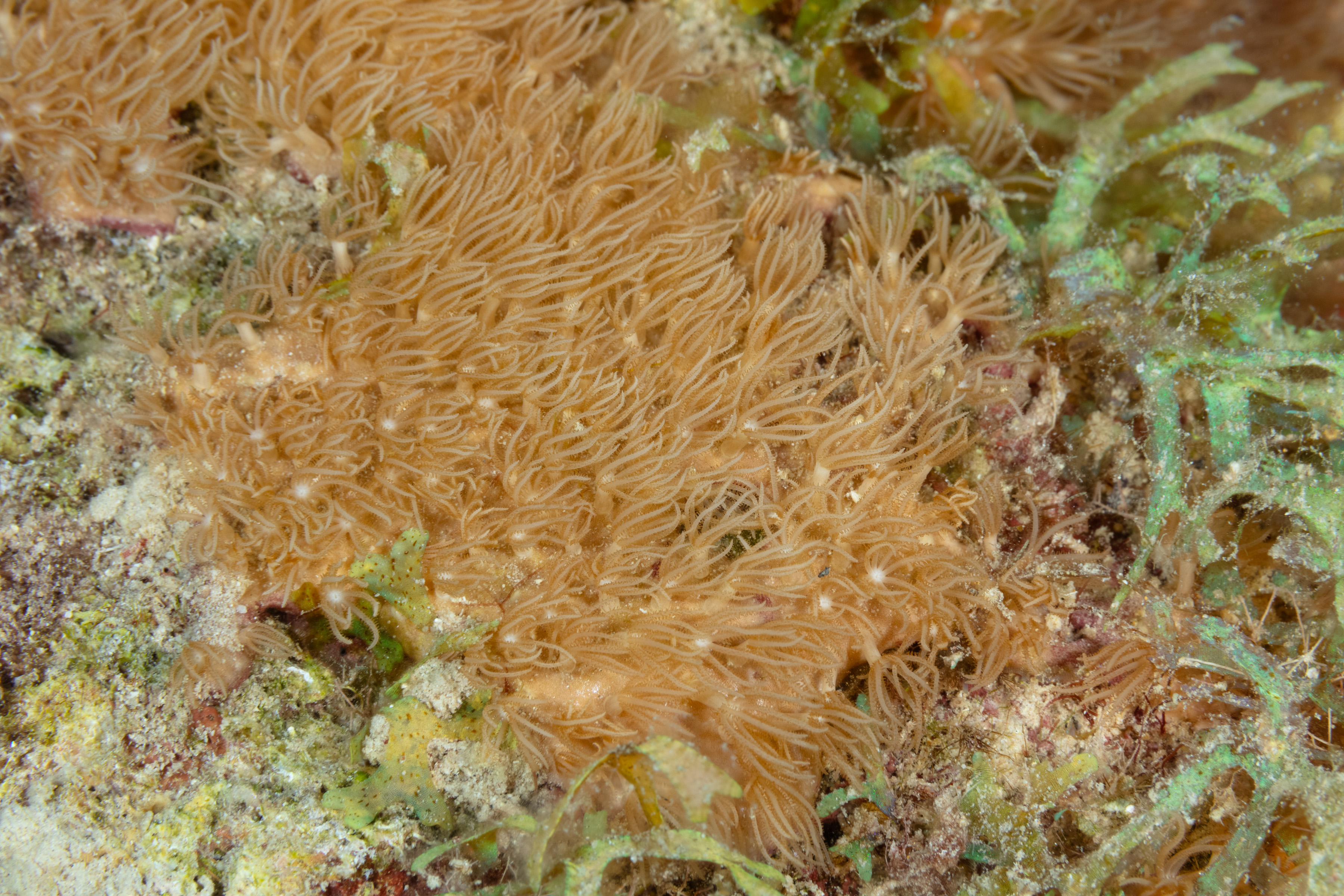 This Gorgonian forms flat, branching colonies covered in soft, light brown tissue with fine tentacles. Its pale polyps are usually retracted during the day, and its main stalks are dark brown.