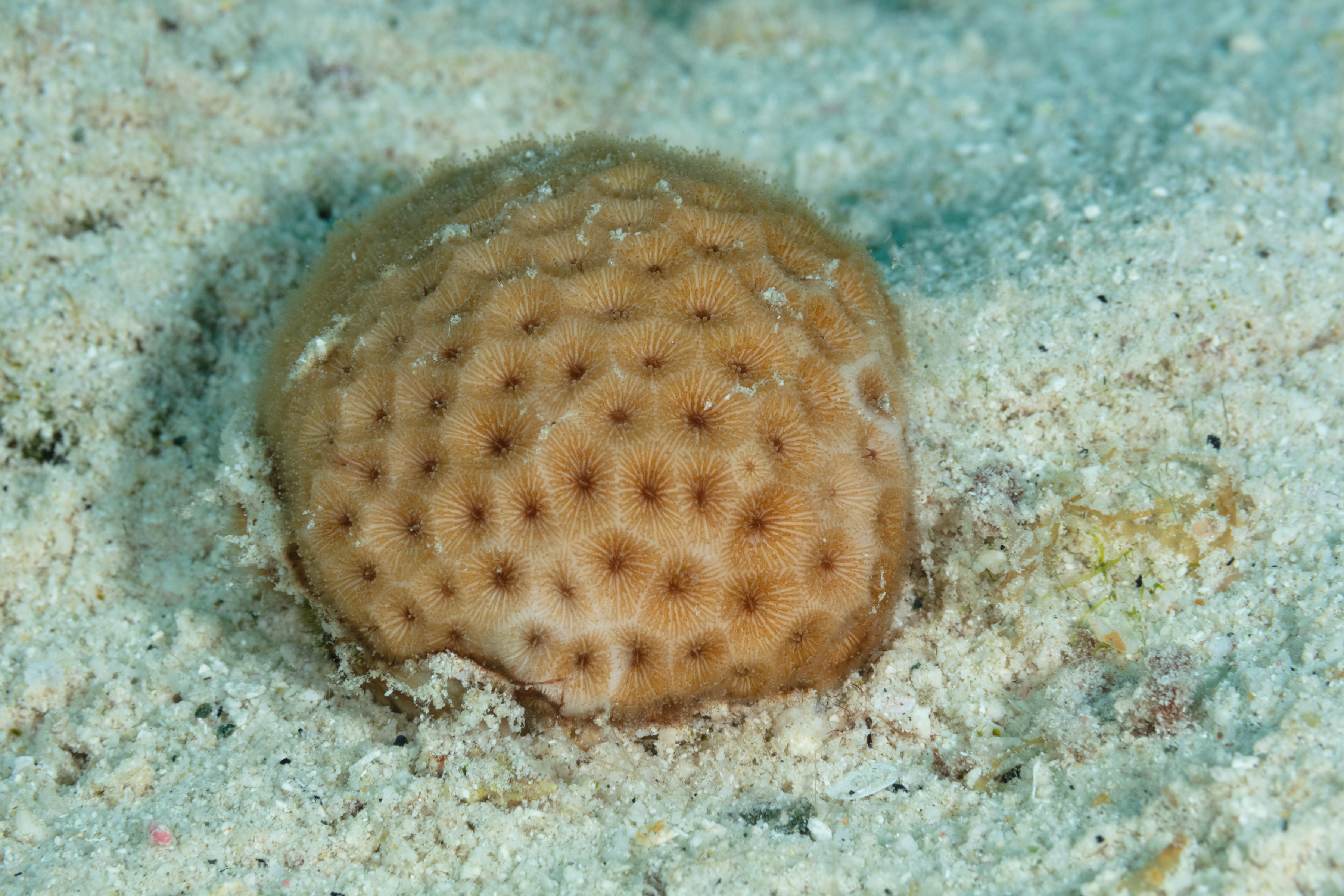 This Coral grows into massive, rounded domes or boulder shapes with a smooth, dimpled surface. Its surface is covered with tiny, pale, round pits that are evenly spaced. The coral's color can range from golden brown to gray, and the pits do not have darker centers.