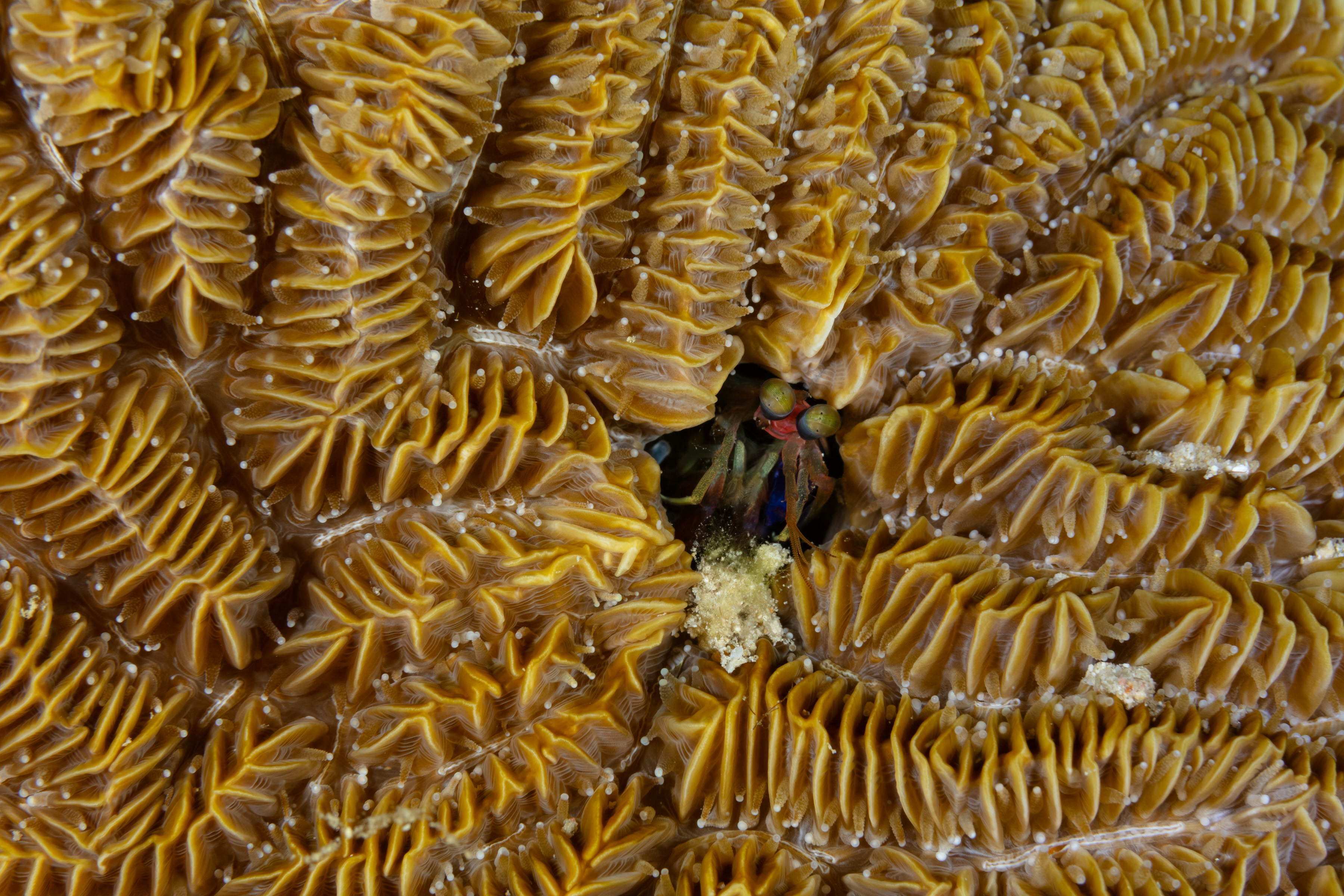 Maze Coral offers shelter for small reef animals. Its large polyps extend at night to catch zooplankton (tiny drifting animals such as larvae and small crustaceans) with sticky tentacles. It is now critically endangered due to diseases like Stony Coral Tissue Loss and bleaching.