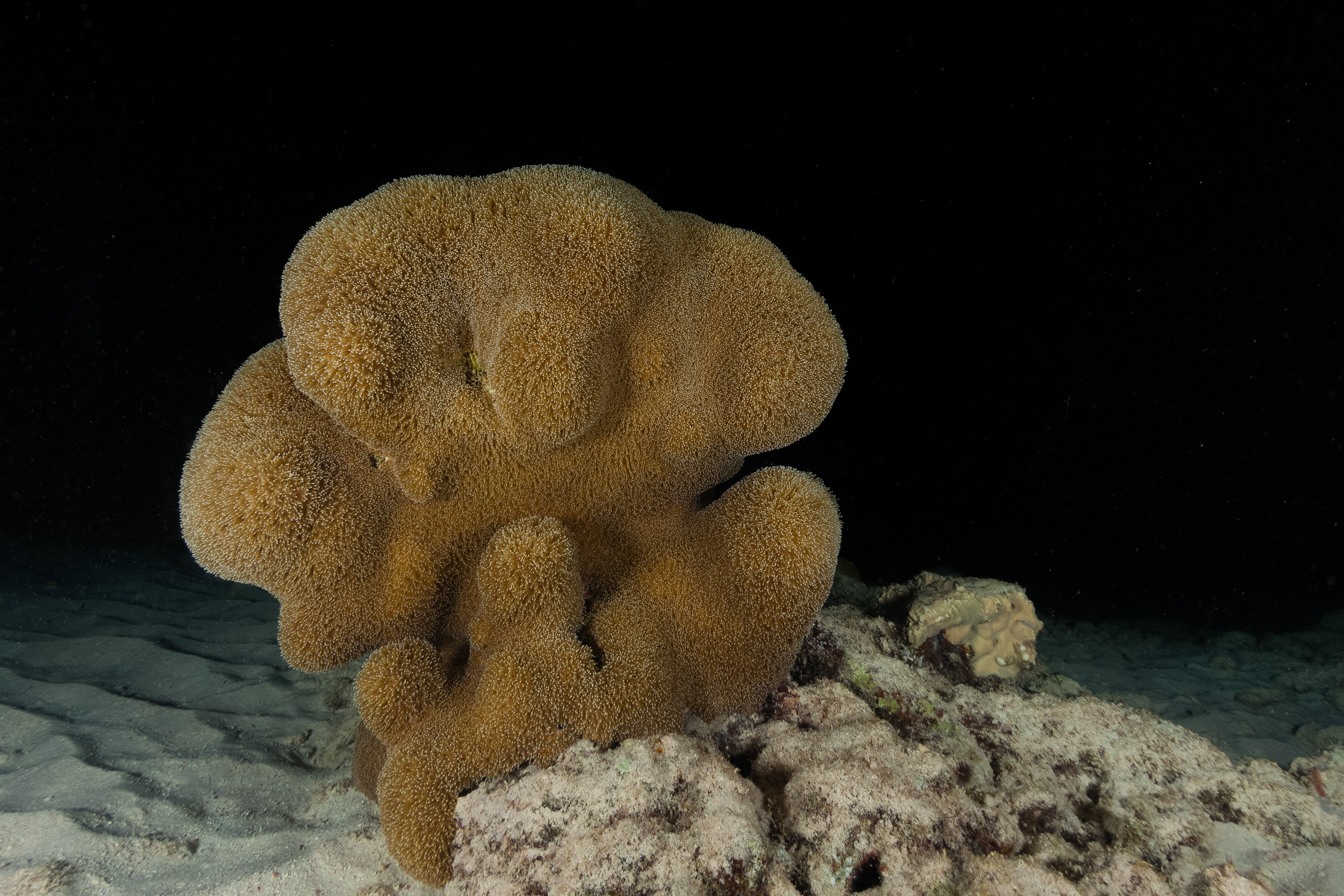 This Coral forms colonies with cylindrical spires that rise from a shared base. Its color ranges from light tan to chocolate brown, and the dense polyps covering the surface give it a fuzzy appearance.