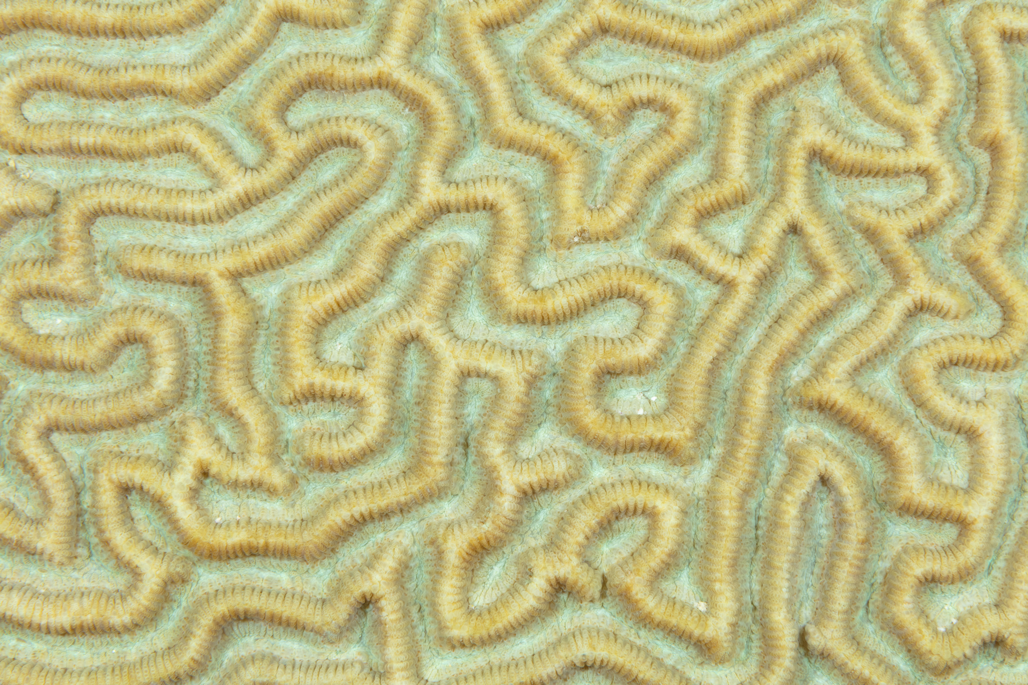 Symmetrical Brain Coral grows in rounded plates or dome-shaped colonies. The surface shows long winding valleys that often link together and become straighter near the outer edge. The ridges are smoothly curved and usually do not have a groove across the top. Colors range from green to brown, yellow-brown or bluish gray and the valleys are often lighter or show a different shade.
