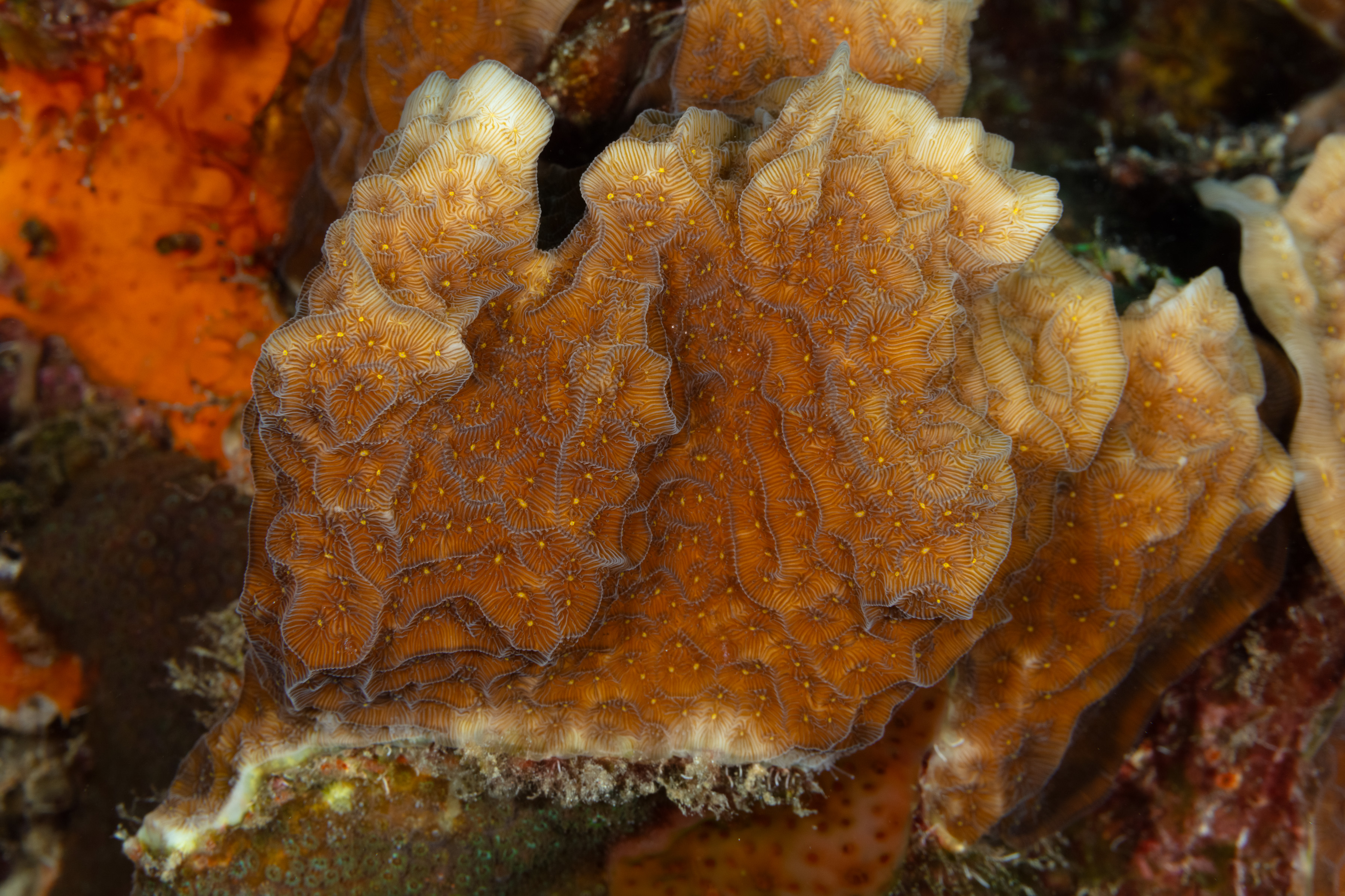 This Coral grows in thin, upright blades that resemble lettuce or layered leaves. Small polyps cover both sides of each blade. The blades are usually light to dark brown, often with yellowish hues, and the edges are slightly paler.