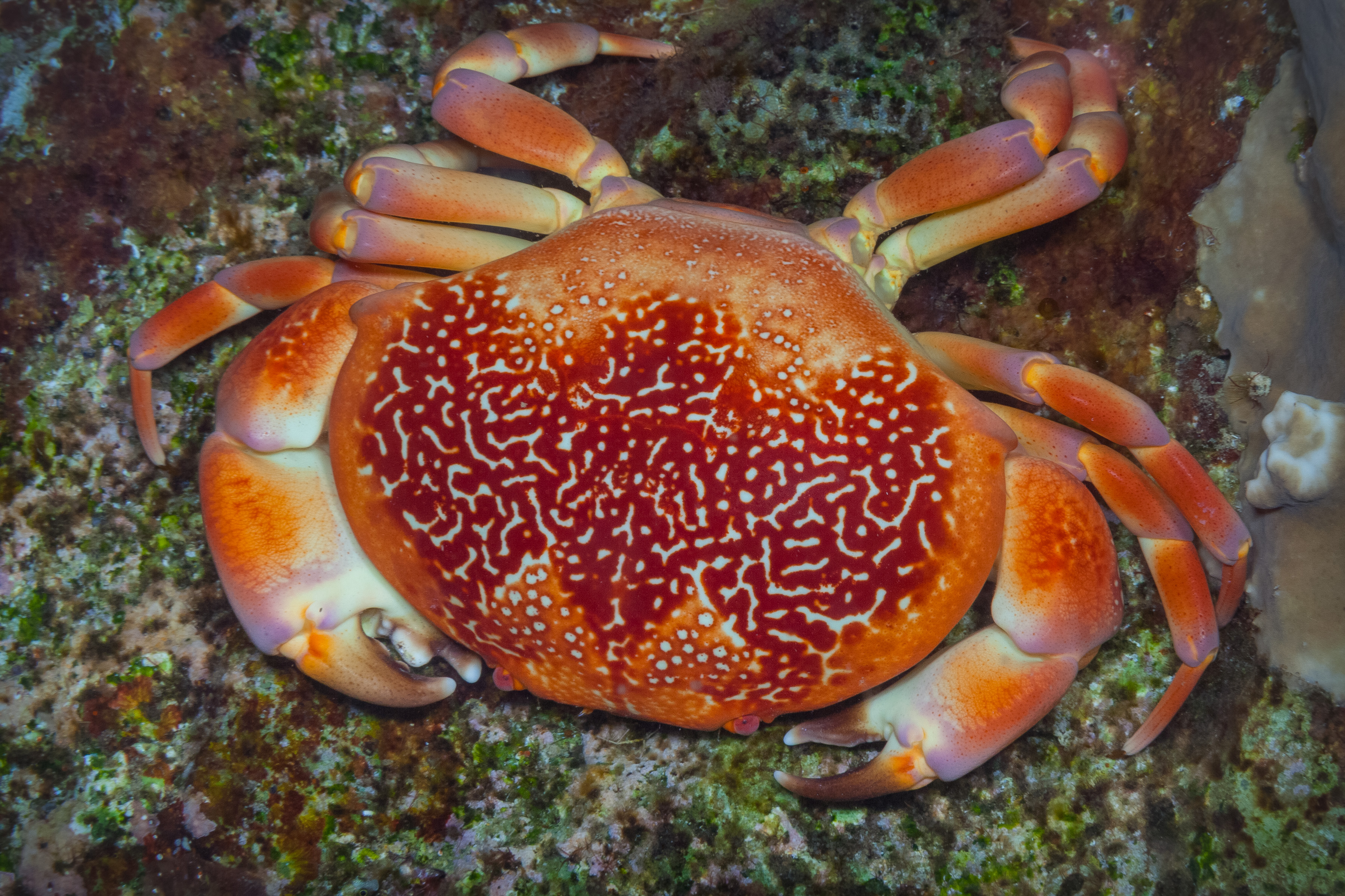 This Crab has a bright red carapace covered with white markings. Its legs display soft hints of purple and yellow near the joints. The claws are short, sturdy, and tipped with a dark color. Juveniles feature a round white carapace with dark red markings.