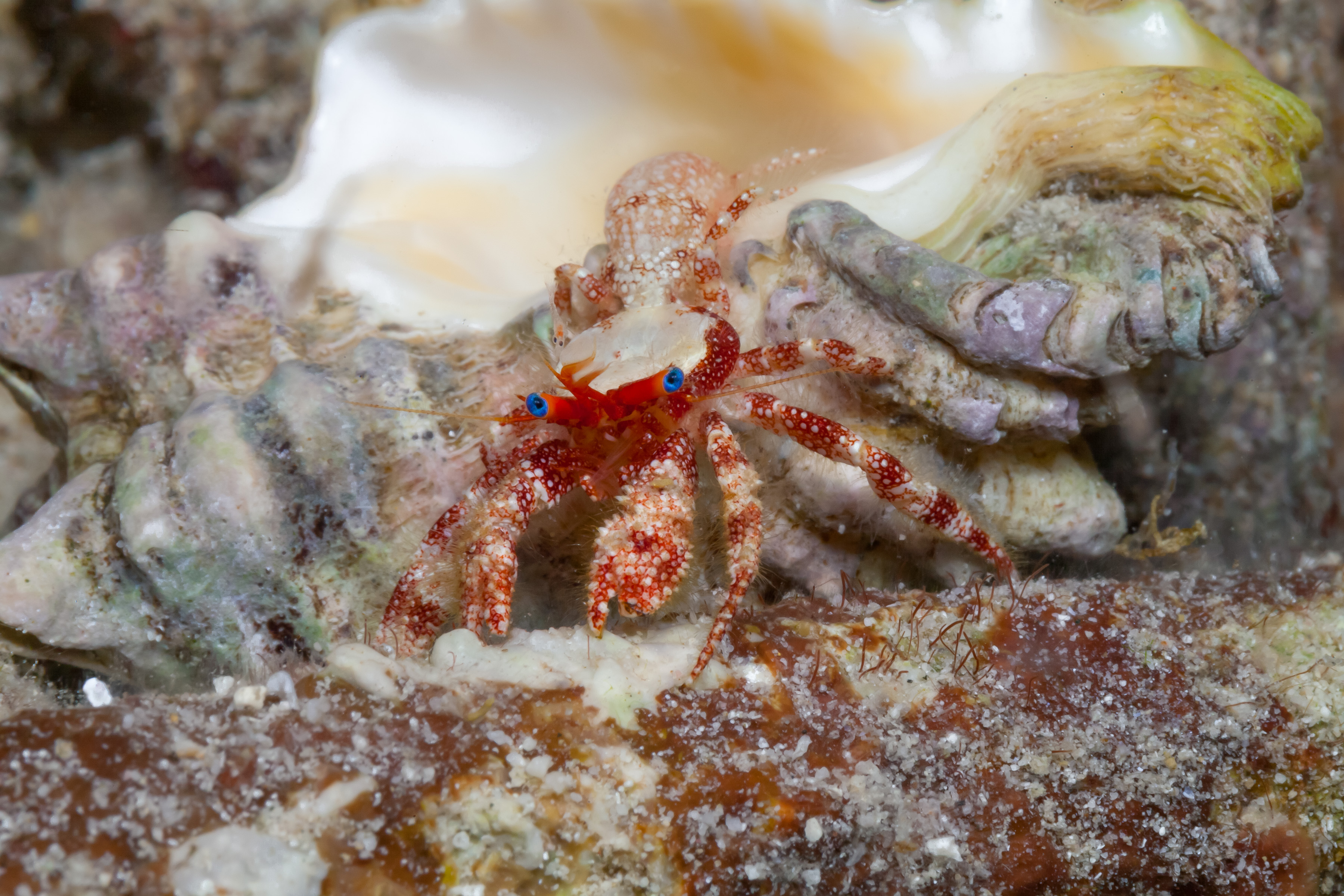 This Hermit Crab has small, bright blue eyes on red eyestalks, banded legs, and claws of equal size.