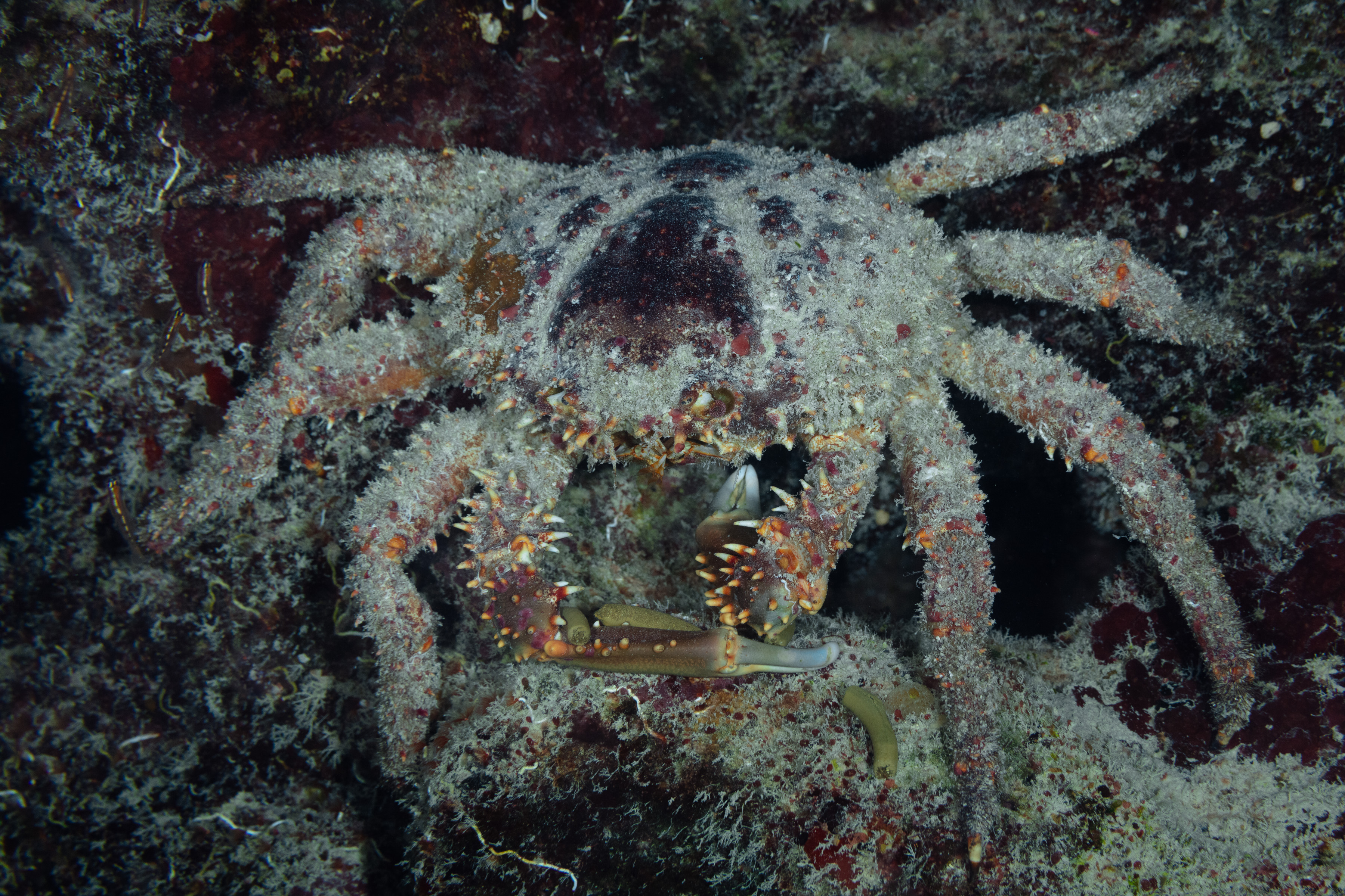 Channel Clinging Crabs, also known as King Crabs, often hide in caves and under ledges.