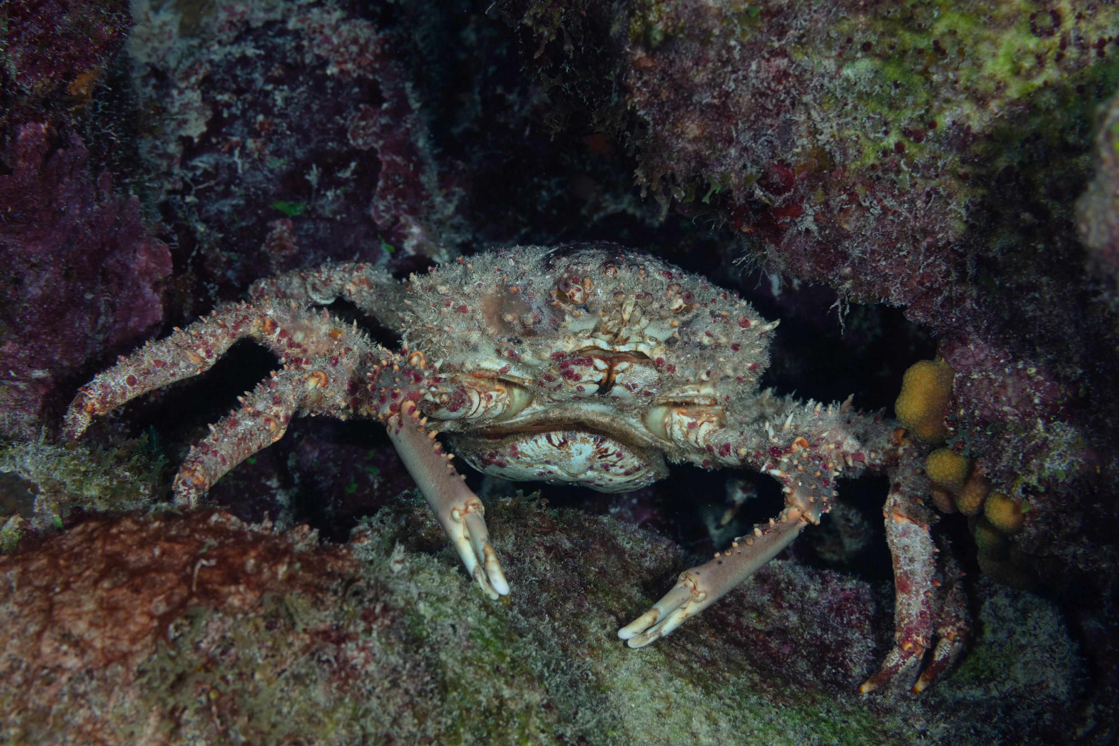 Channel Clinging Crabs, also known as King Crabs, often hide in caves and under ledges.