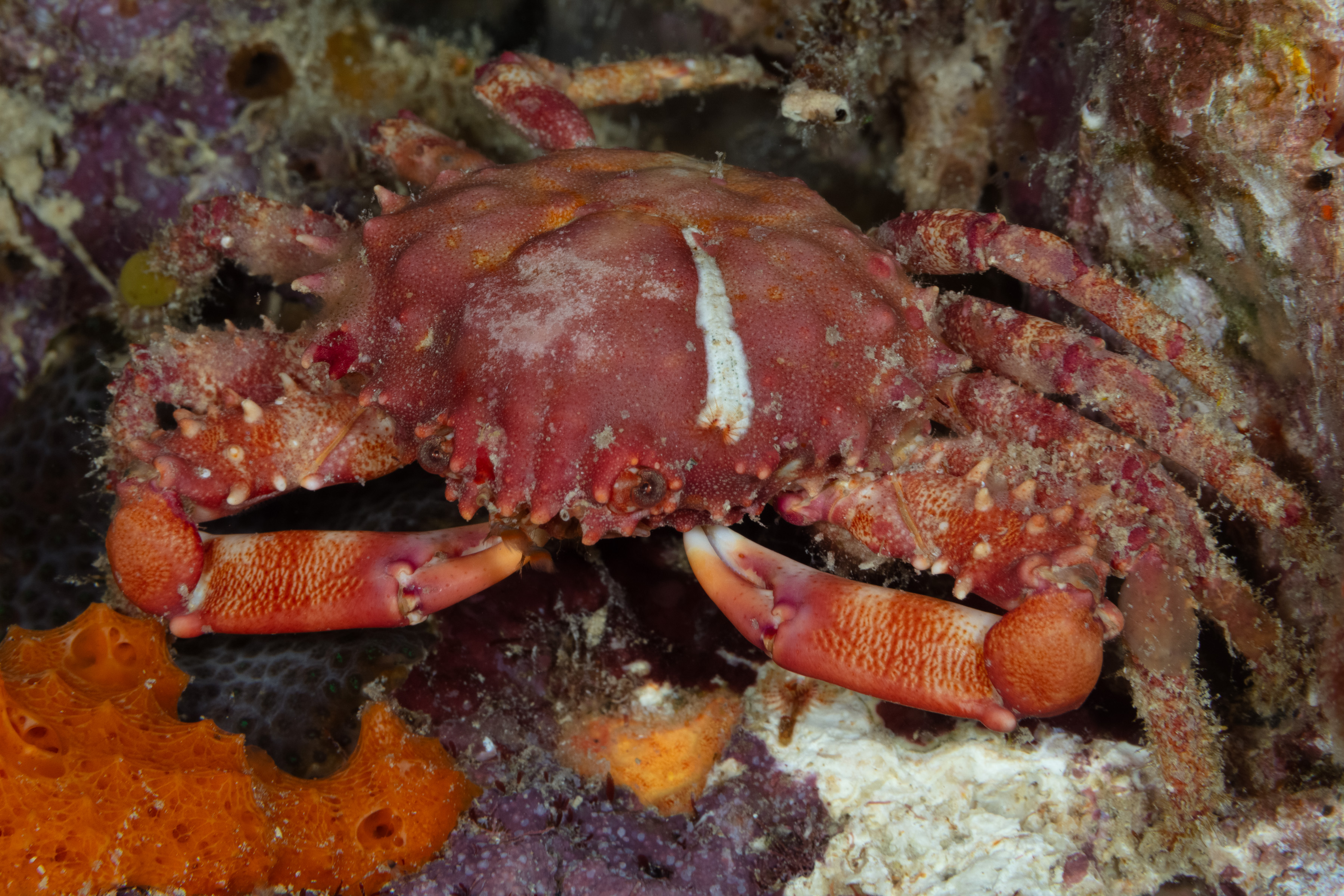 This Crab has an orange to red carapace with spines along the sides and on its claw arms. Its walking legs are often covered in algae.