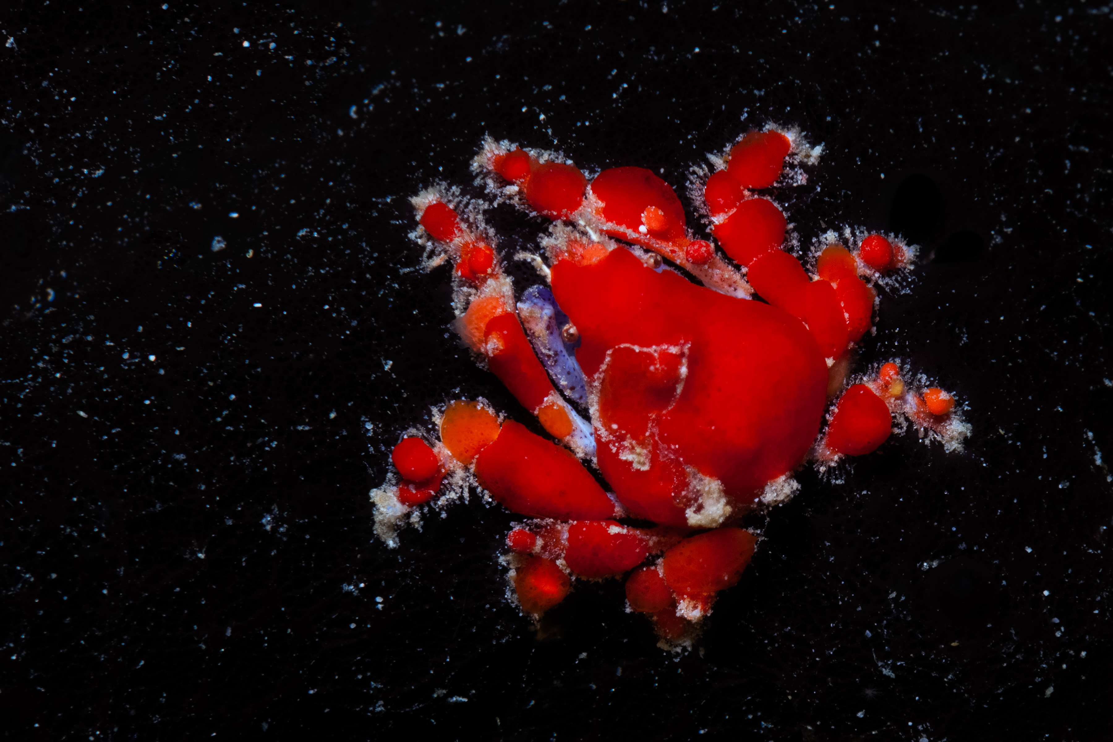 This Crab has a triangular carapace that is bright red or orange and can be covered with pieces of sponge. Its claw arms are purplish and marked with dark specks.