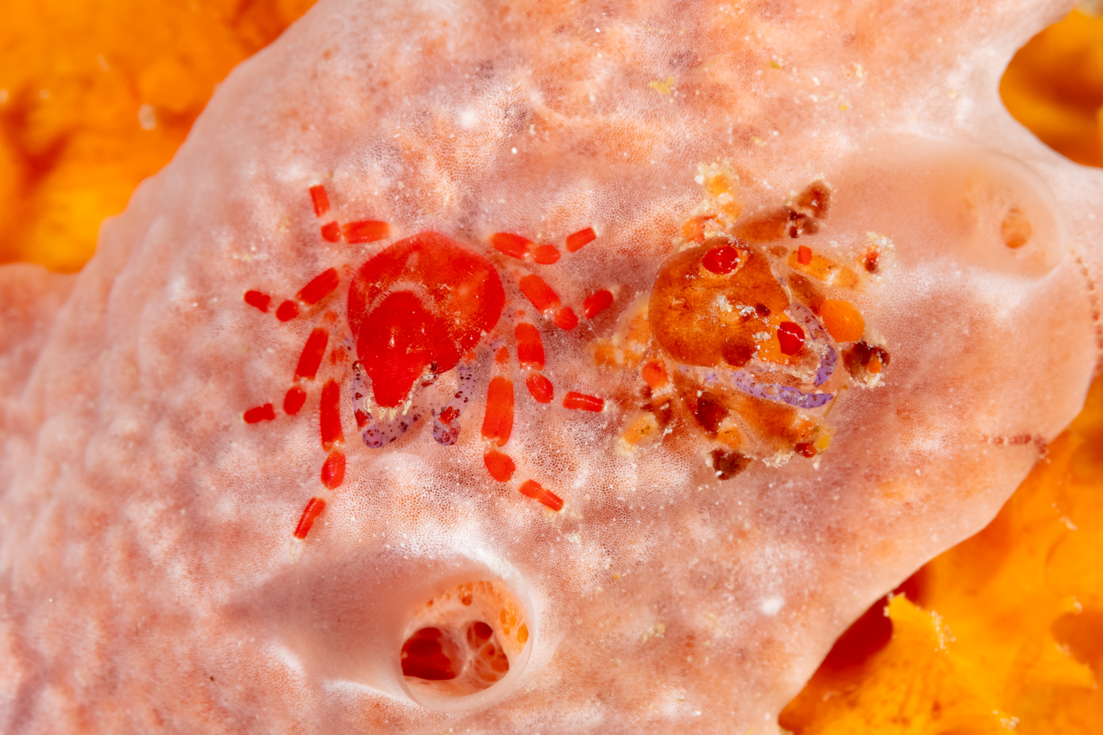 This Crab has a triangular carapace that is bright red or orange and can be covered with pieces of sponge. Its claw arms are purplish and marked with dark specks.