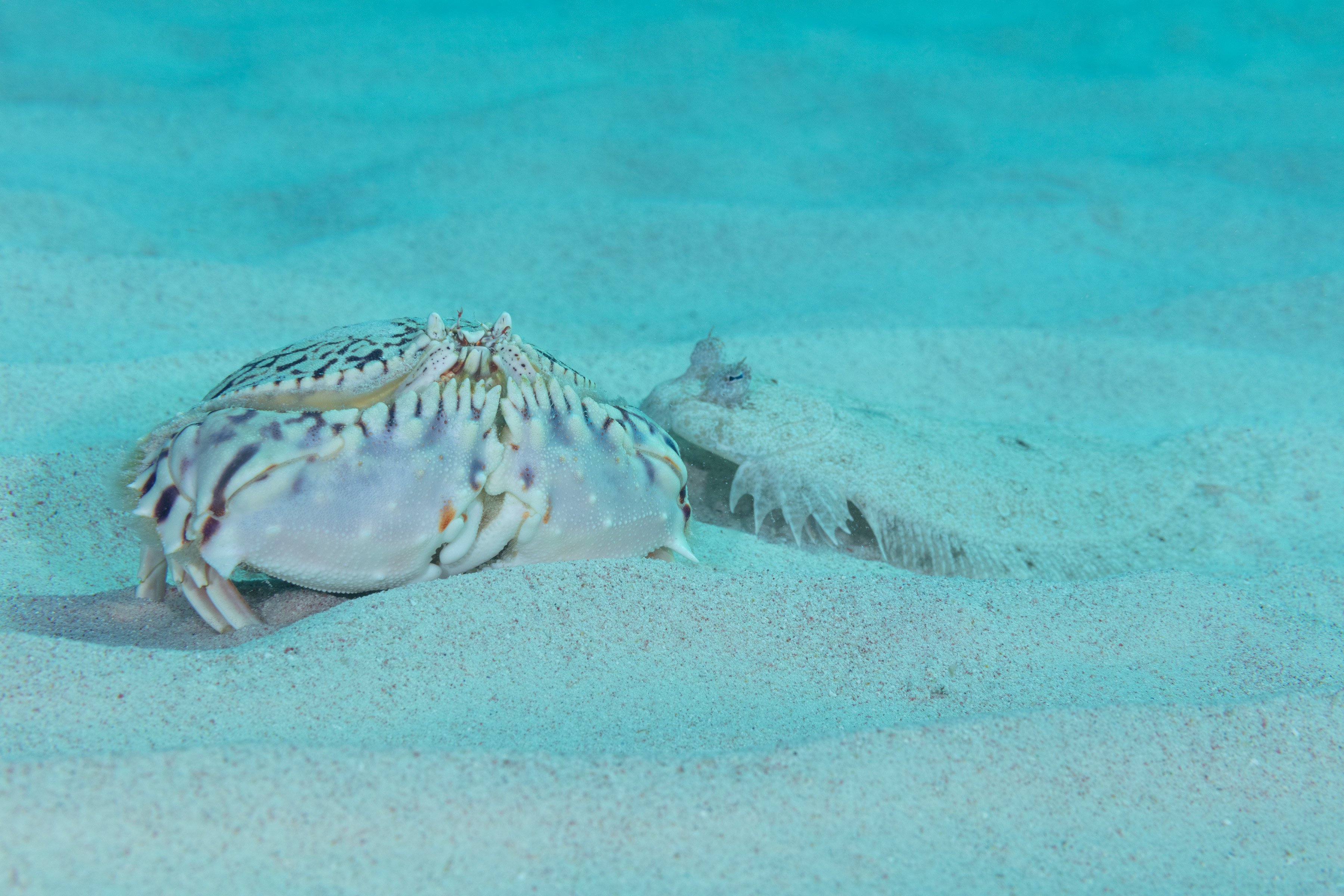 The Flame Box Crab can be followed by Maculated Flounders that feed on small animals it disturbs while digging.
