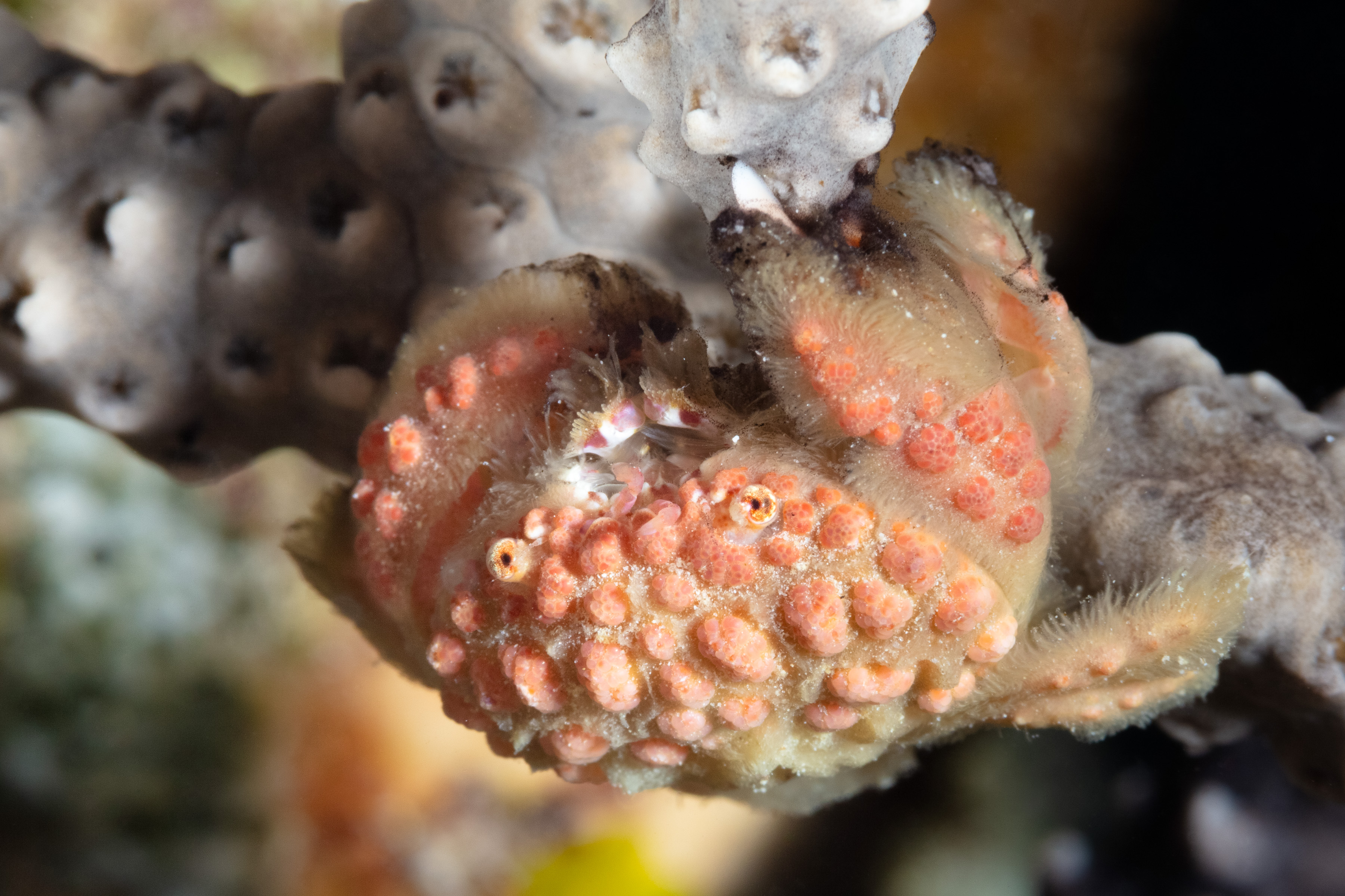 This Rubble Crab has a rounded, nodose carapace covered in small bumps in shades of pink and orange. Its edges and arms are lined with short, feathery yellow bristles.