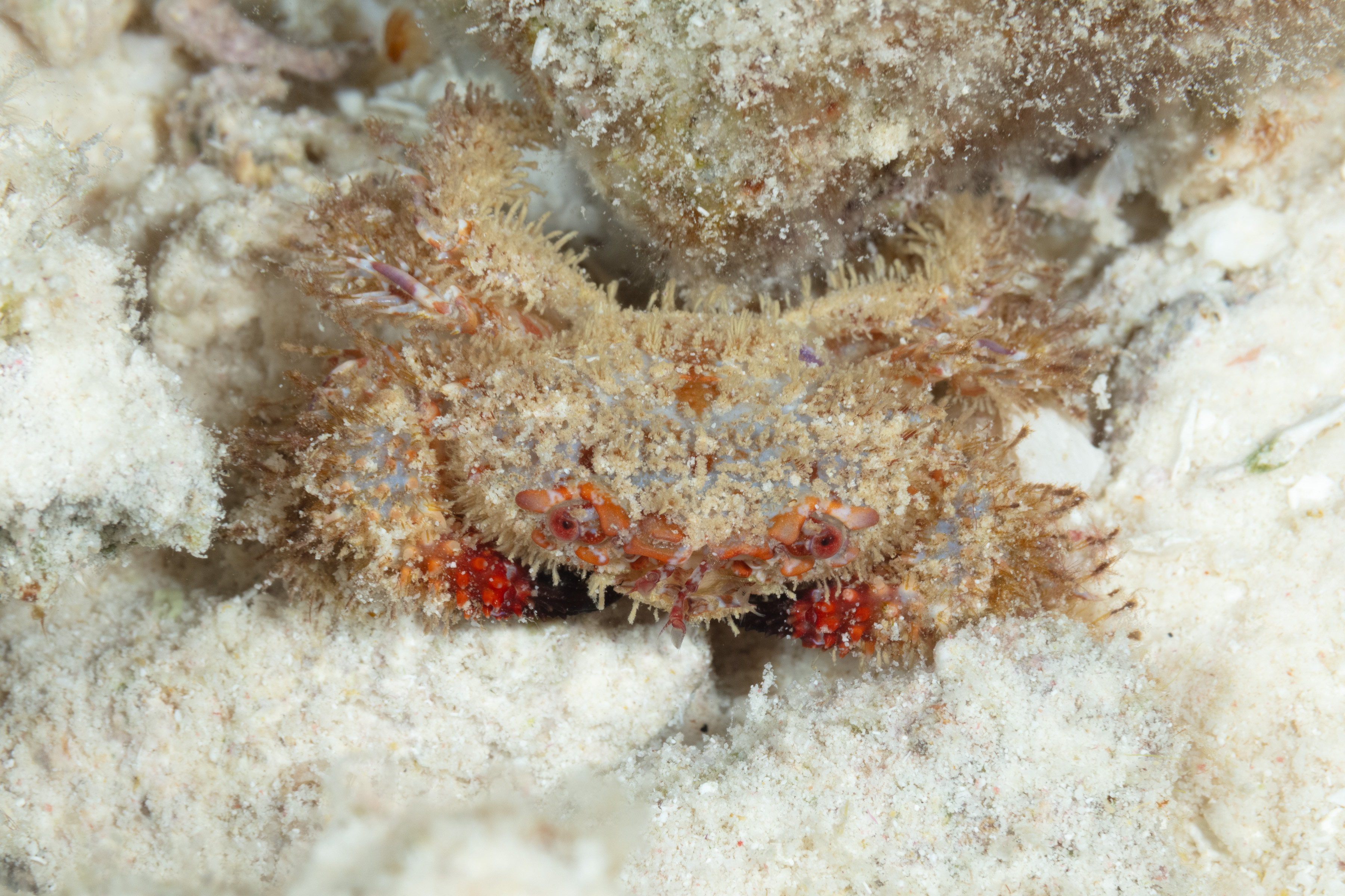 The Longspine Hairy Crab has a very hairy body and legs. Its arms are deep red and covered with short spines, and the claw tips are black.